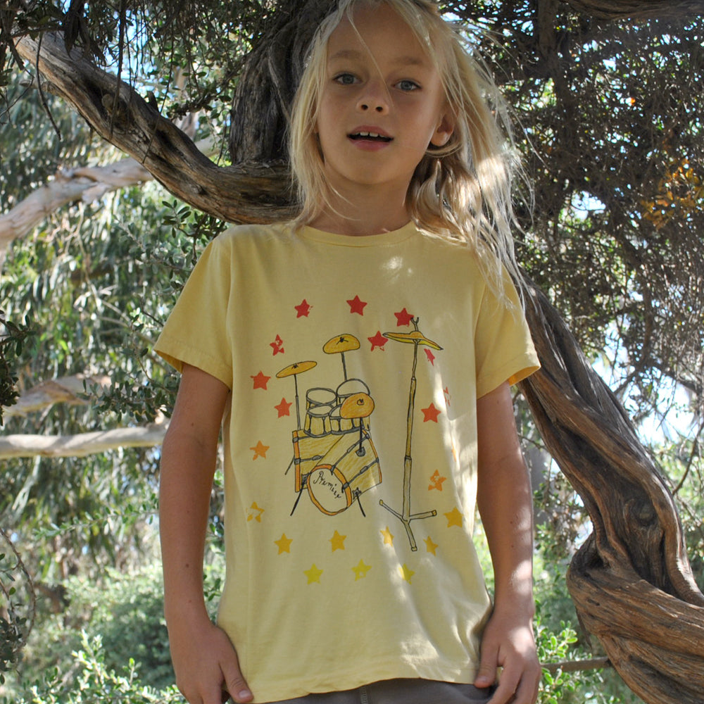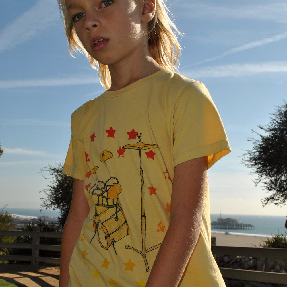 Hand drawn illustration of Keith Moon’s gold plated drum kit.