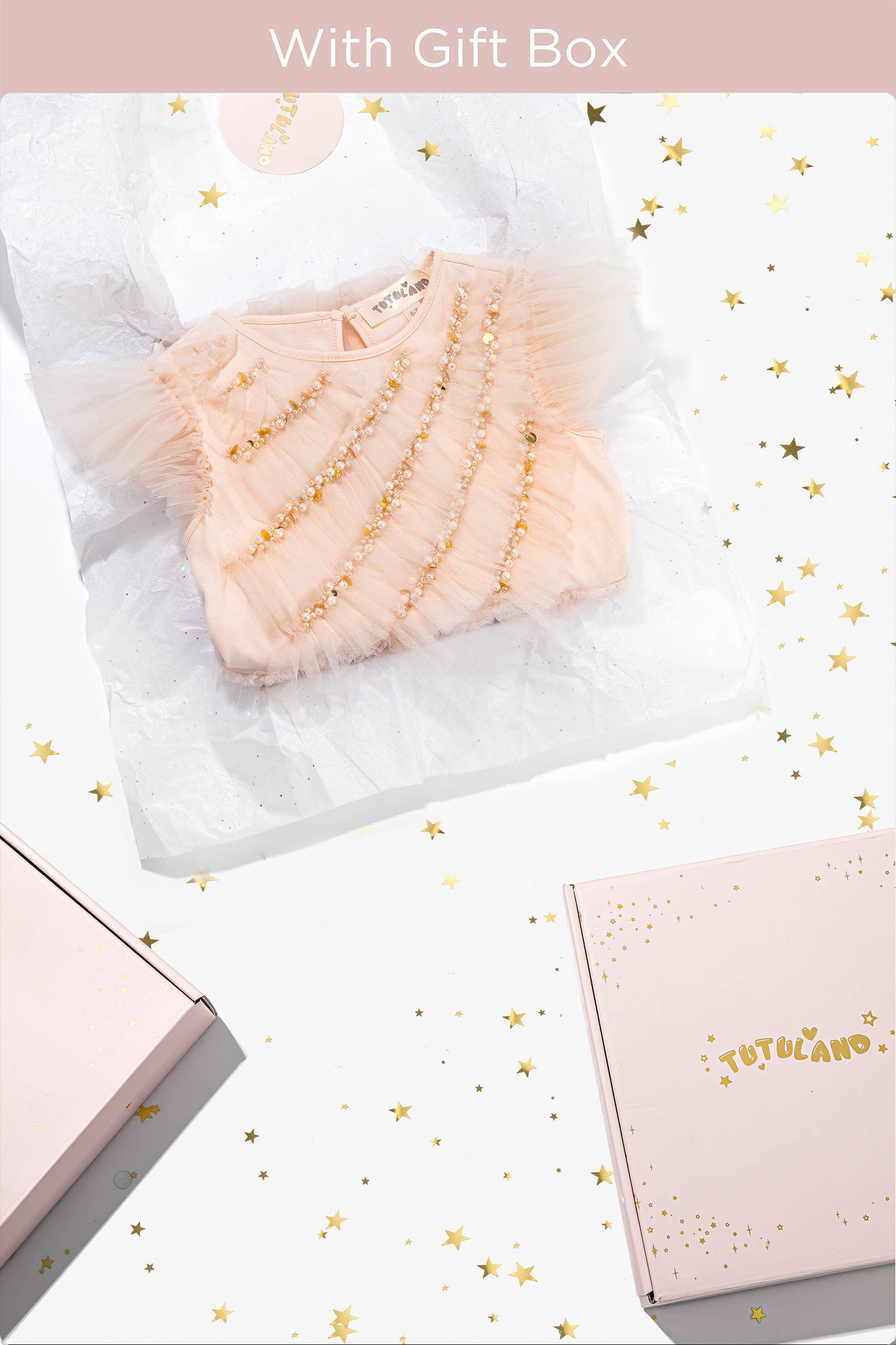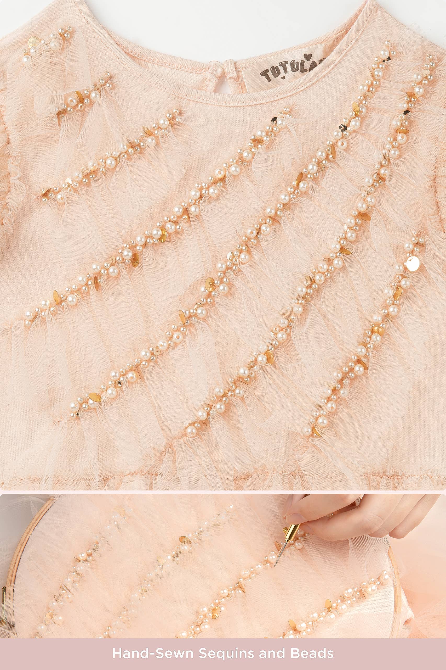 Designed with whimsical charm and delightful elegance, this dress is perfect for making cherished memories. The delicate flutter sleeves, adorned with tiny pearls, add a touch of fairy-tale magic, while the tutu dress ensures a playful twirl that every little girl will adore.