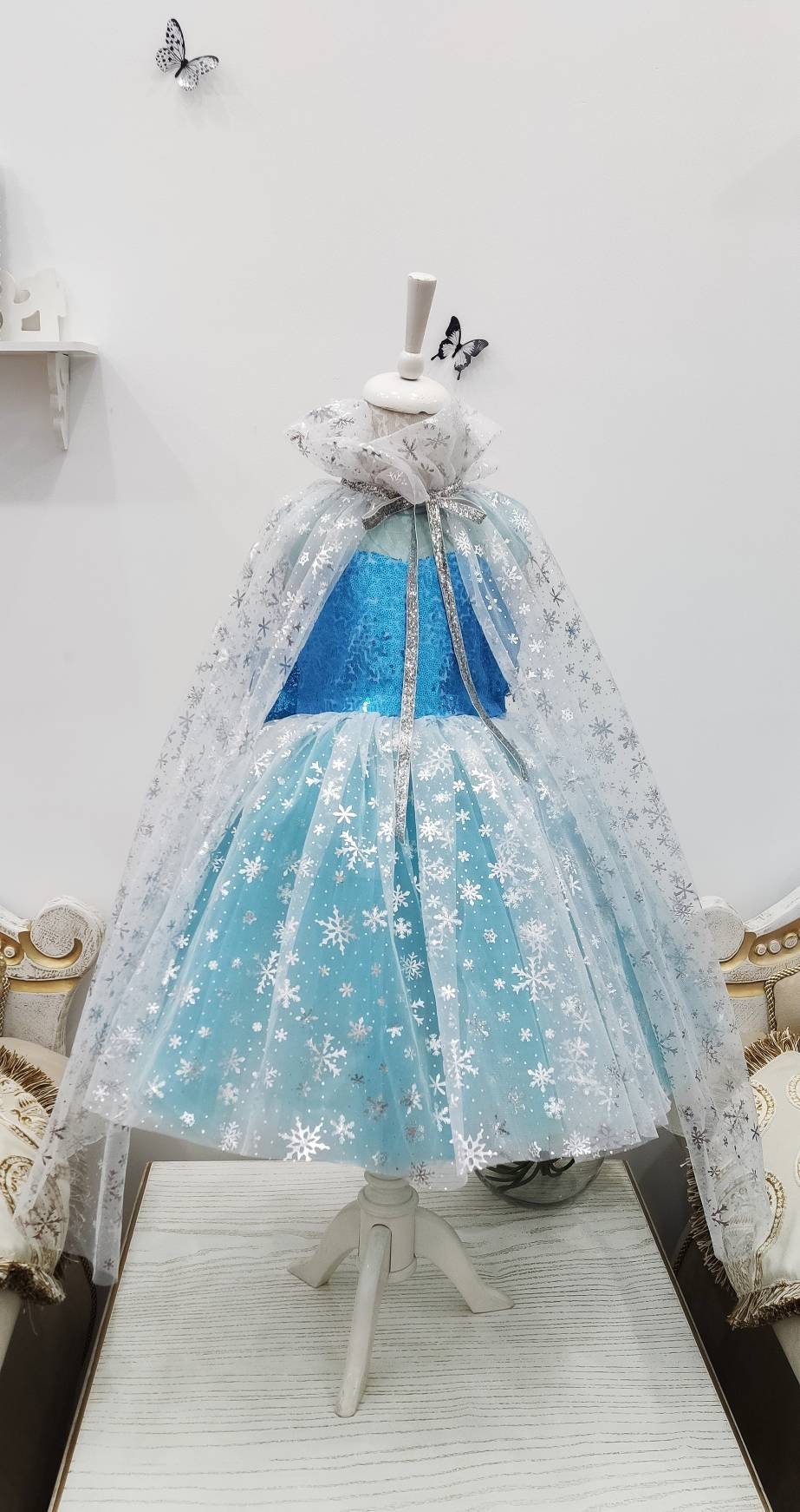 This Elsa inspired dress will make your little girl feel like a real princess from fairy tale. The cape with sparkly snowflakes adds a magic touch and can be removed for a more casual look. Perfect for dress-up or everyday wear.