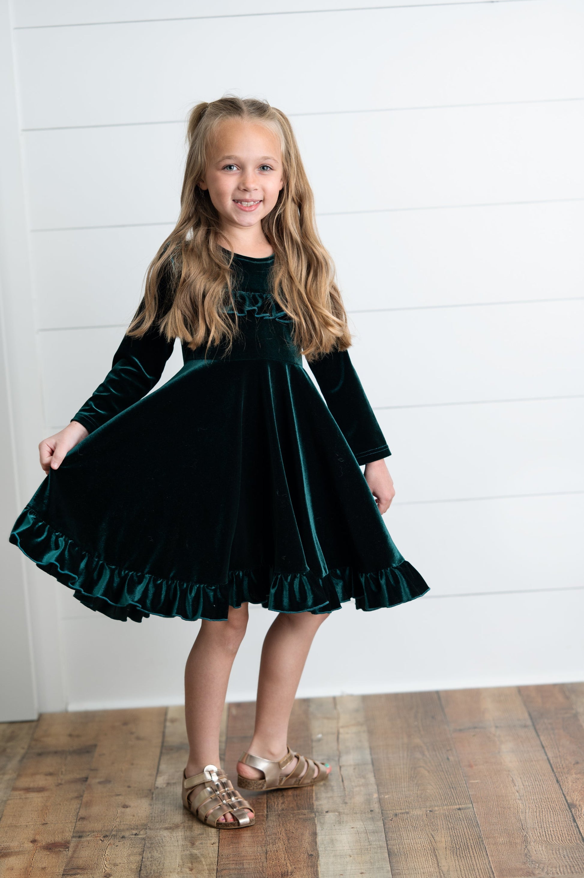 This dress will make her shine like an emerald! Made of soft velvet, it's stylish and comfy. Perfect for any occasion, she'll stand out in this vibrant shade of green. Who said dressing up can't be fun? (Hint: it's not us!)