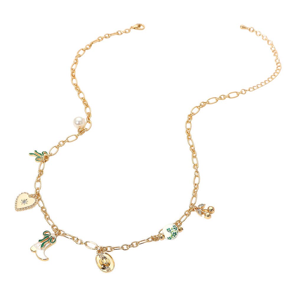 Add playful elegance to your style with this whimsical charm necklace featuring a mix of delicate pendants including a heart, boot, cherry, and floral bead. Perfect for everyday wear or as a standout piece, it blends fun and sophistication in a unique accessory.