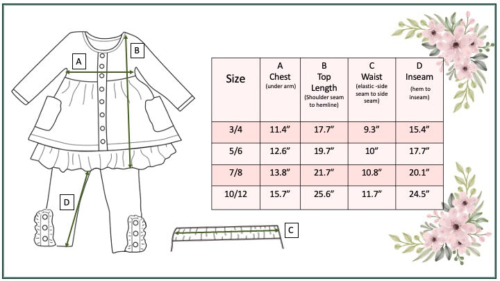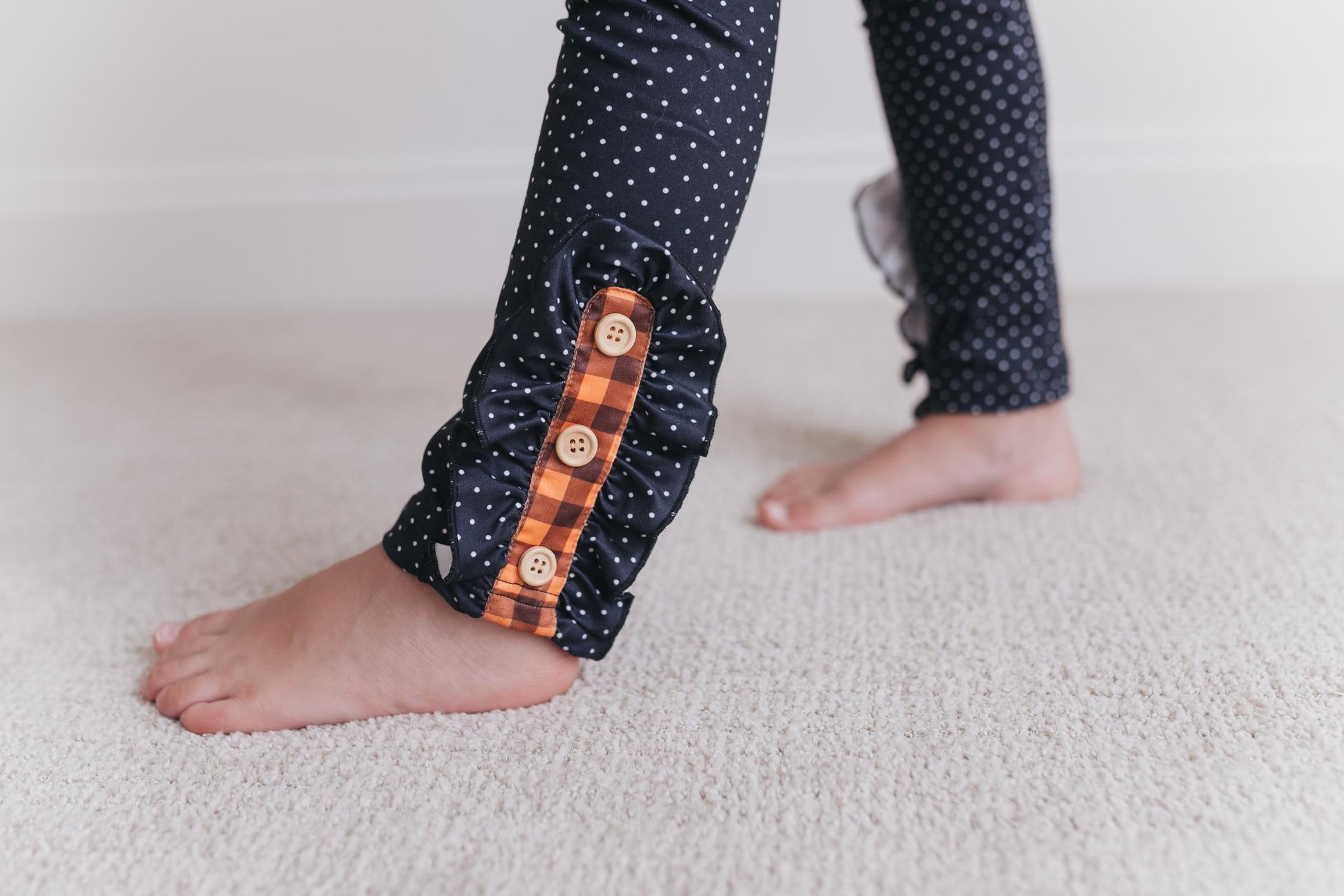 Girls Set includes Rust check gingham & Dark Navy pin dot print long sleeve top with buttons and pocket details. Navy pin dot legging pants with ruffle & button ankle details. Great outfit for Fall and Winter!