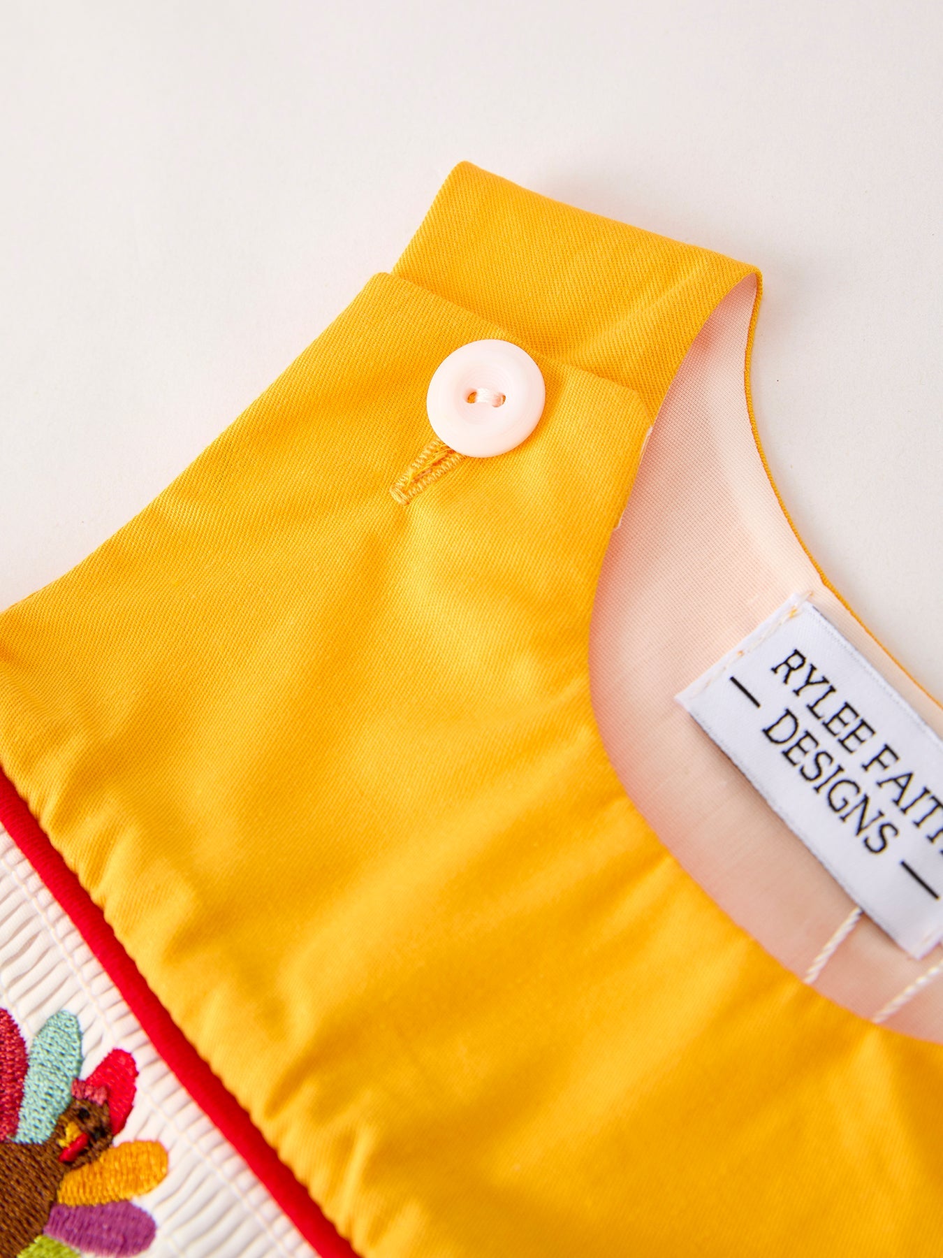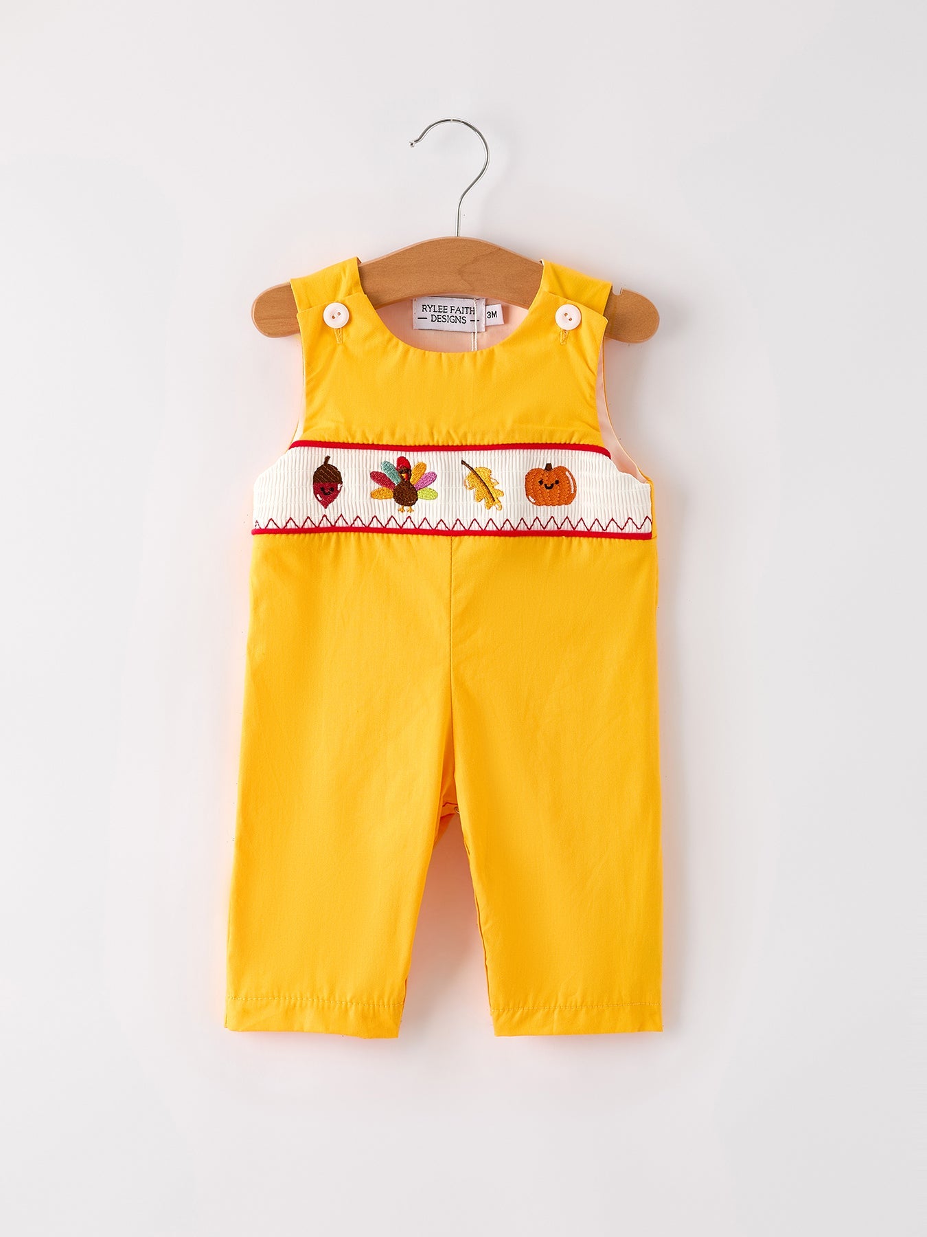 Fall Halloween & Thanksgiving Turkey Nuts Smock Embroidered Yellow Boys Romper