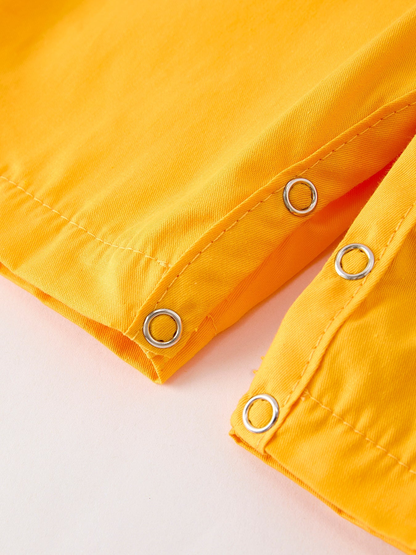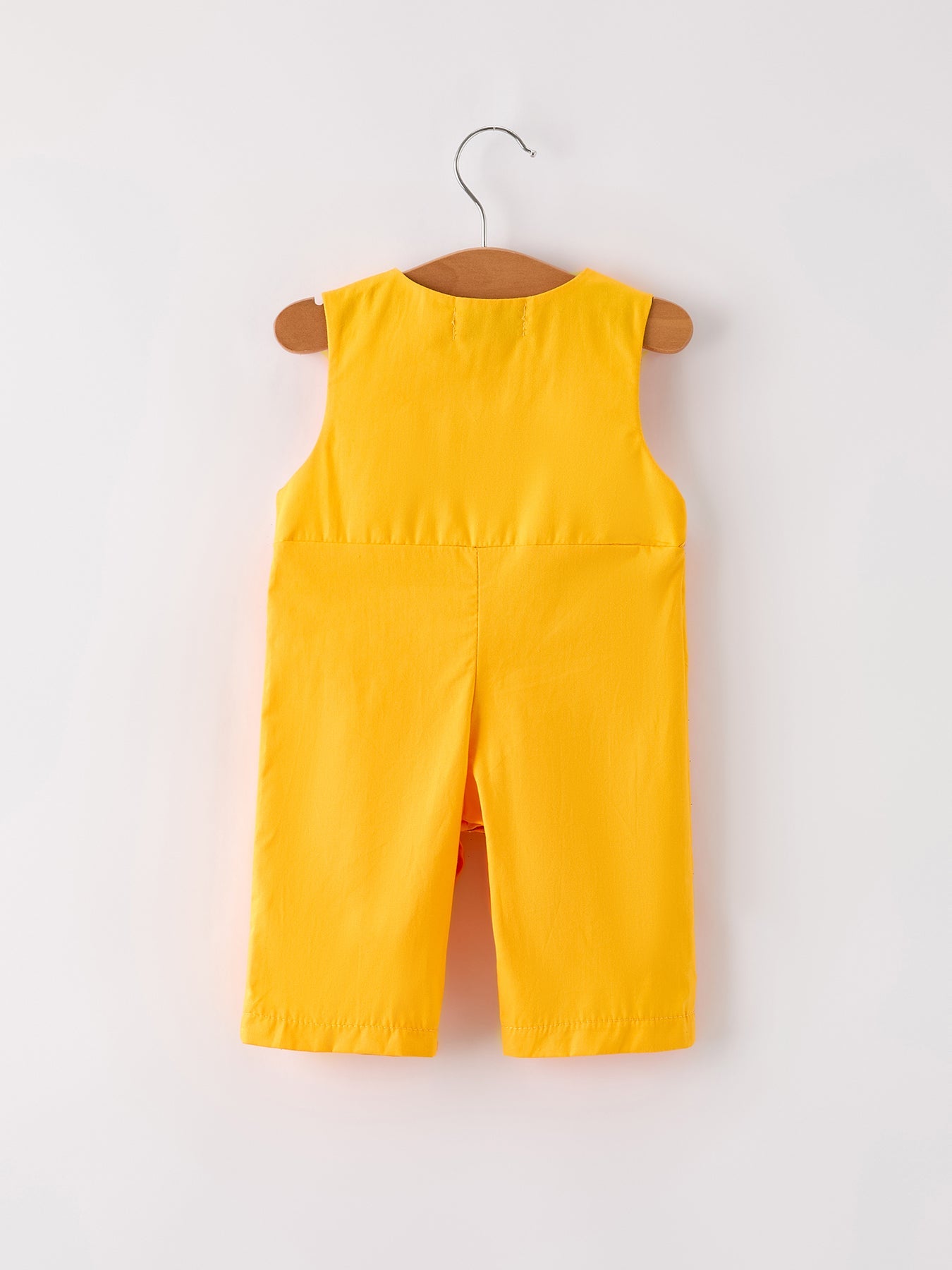 Celebrate the season in style with this charming yellow romper, featuring festive embroidery perfect for Fall, Halloween, and Thanksgiving. Designed for comfort and easy wear, its smock detail adds a classic touch while allowing freedom of movement. Ideal for your little boy’s seasonal gatherings, this romper combines playful holiday spirit with practical design.