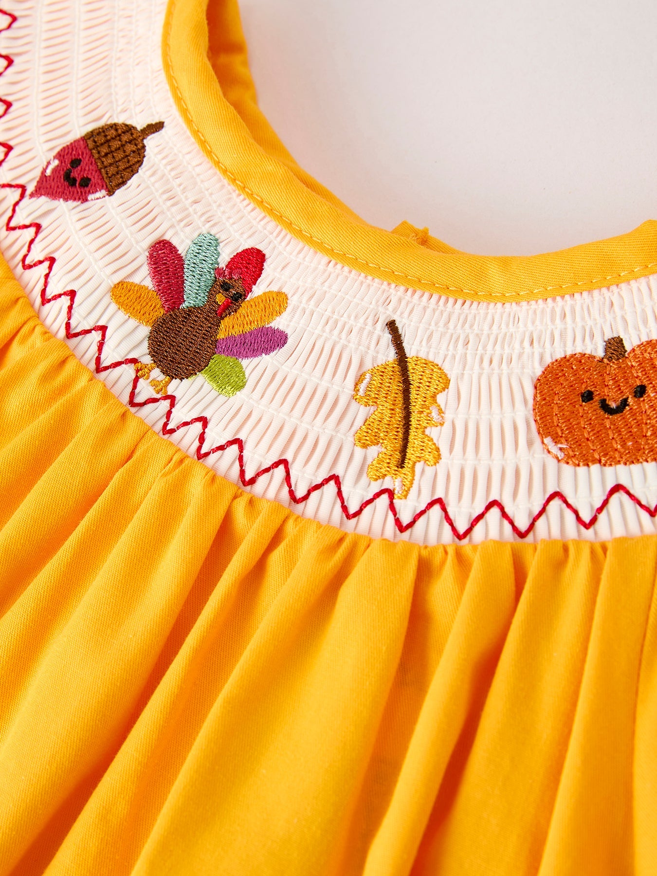 Fall Halloween & Thanksgiving Turkey Nuts Smock Embroidered Yellow Girls Dress