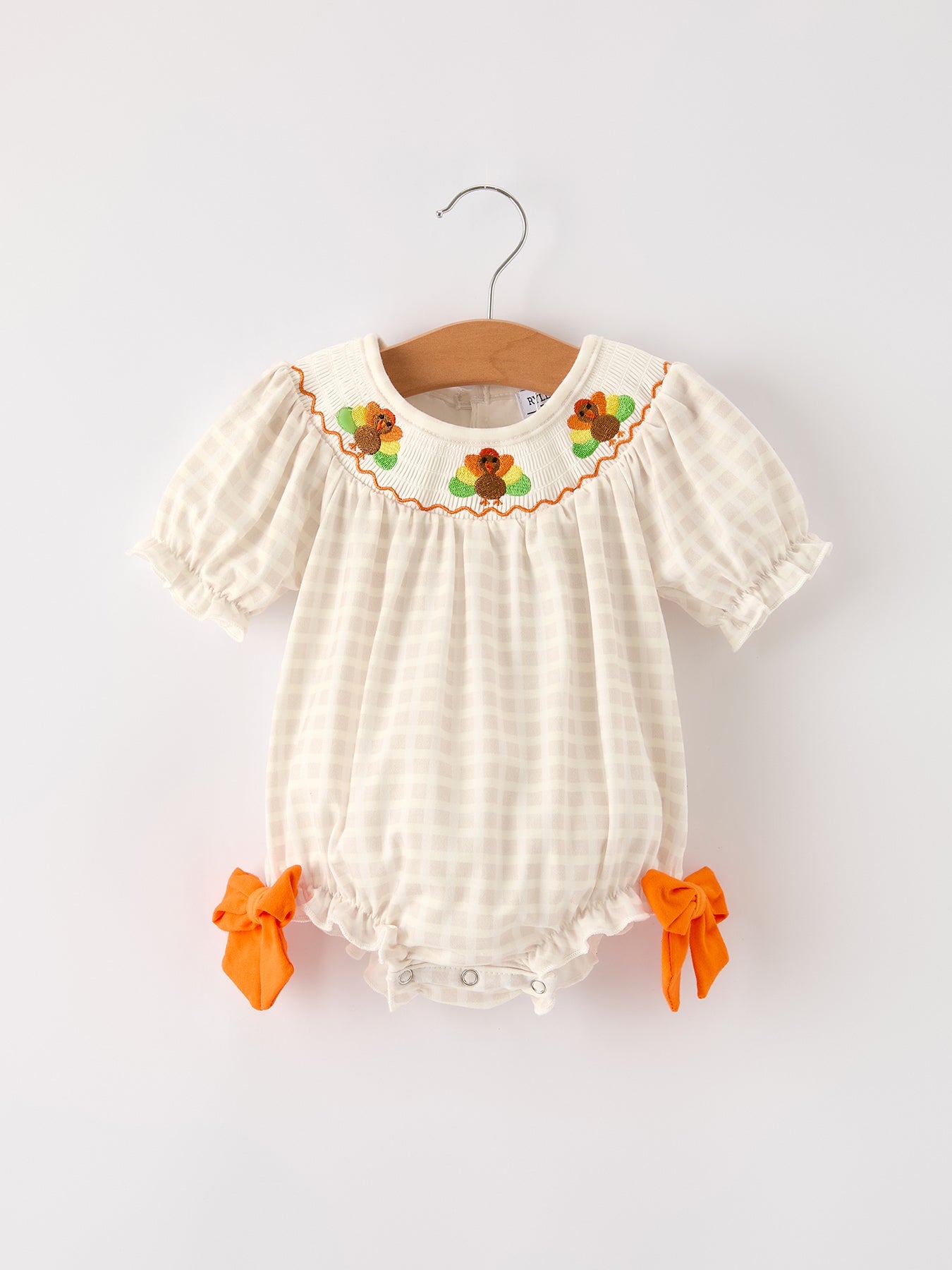 Fall Thanksgiving Apricot Plaid Turkey Embroidery Smocking Baby Girls Romper