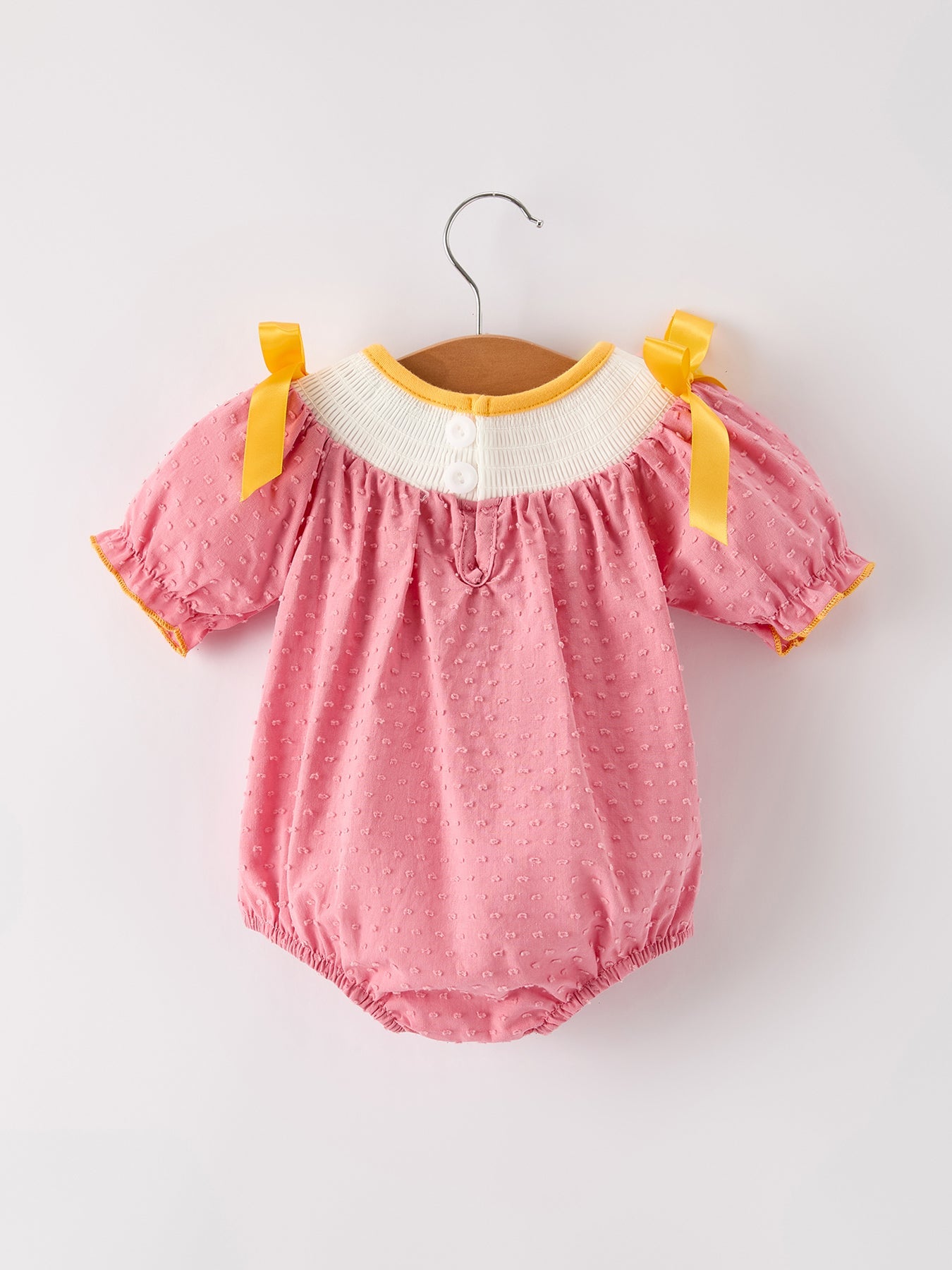 Celebrate the season in style with this adorable baby girls romper, featuring charming turkey and leaf embroidery perfect for Thanksgiving. The delicate smocking and bow details add a touch of classic elegance, while the soft fabric ensures comfort all day long. Ideal for festive family gatherings, this romper combines festive flair with cozy wearability, making it a must-have for your little one’s fall wardrobe.