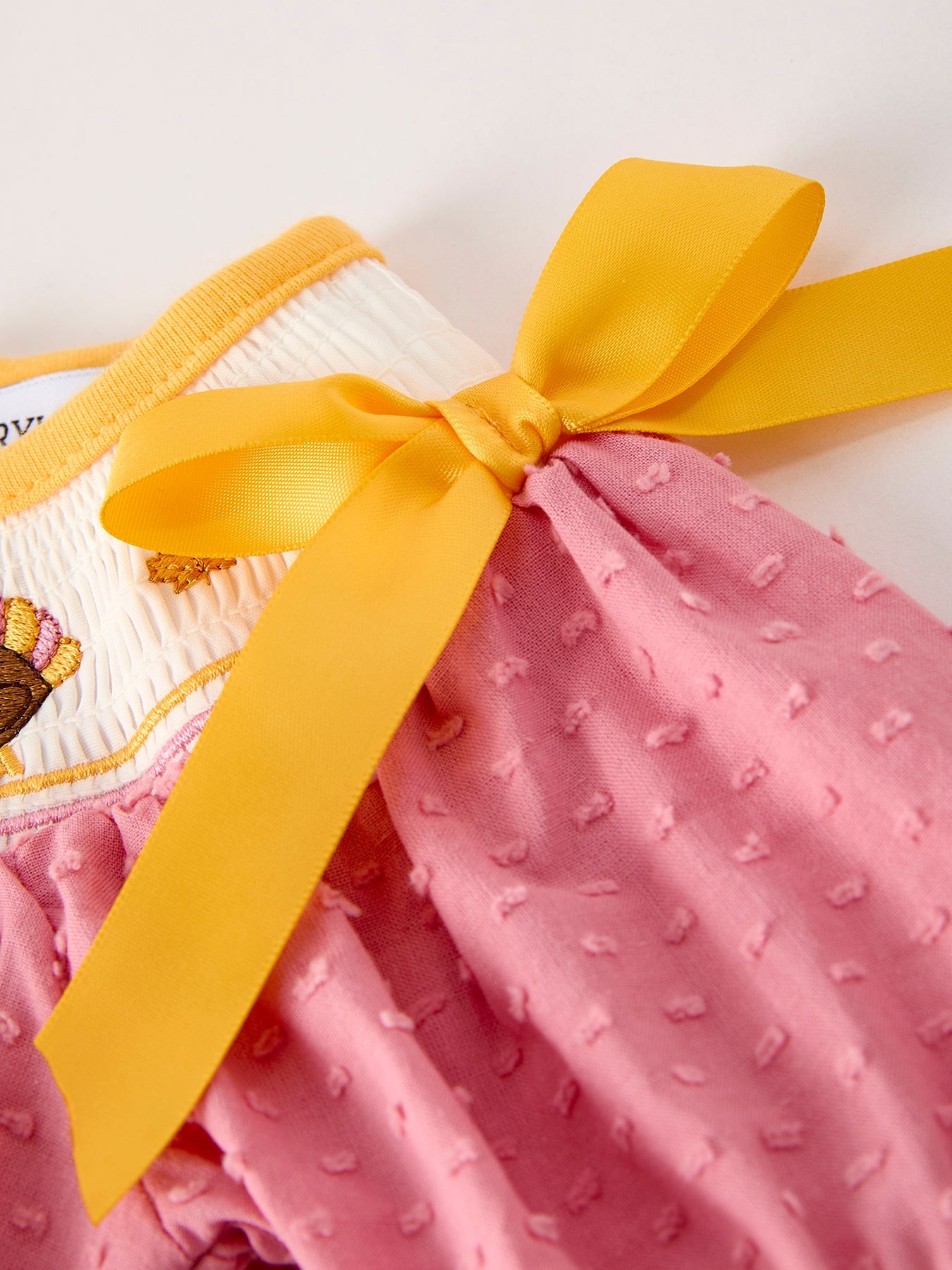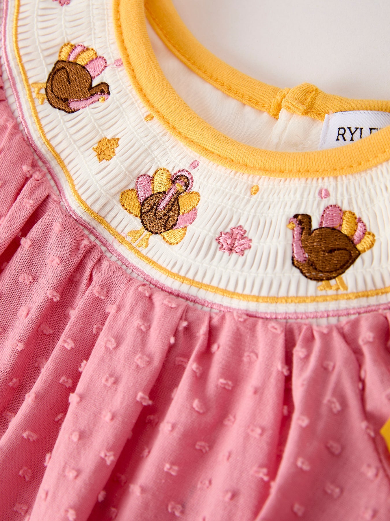 Fall Thanksgiving Turkey Leaf Embroidery Smocking Bow Baby Girls Romper