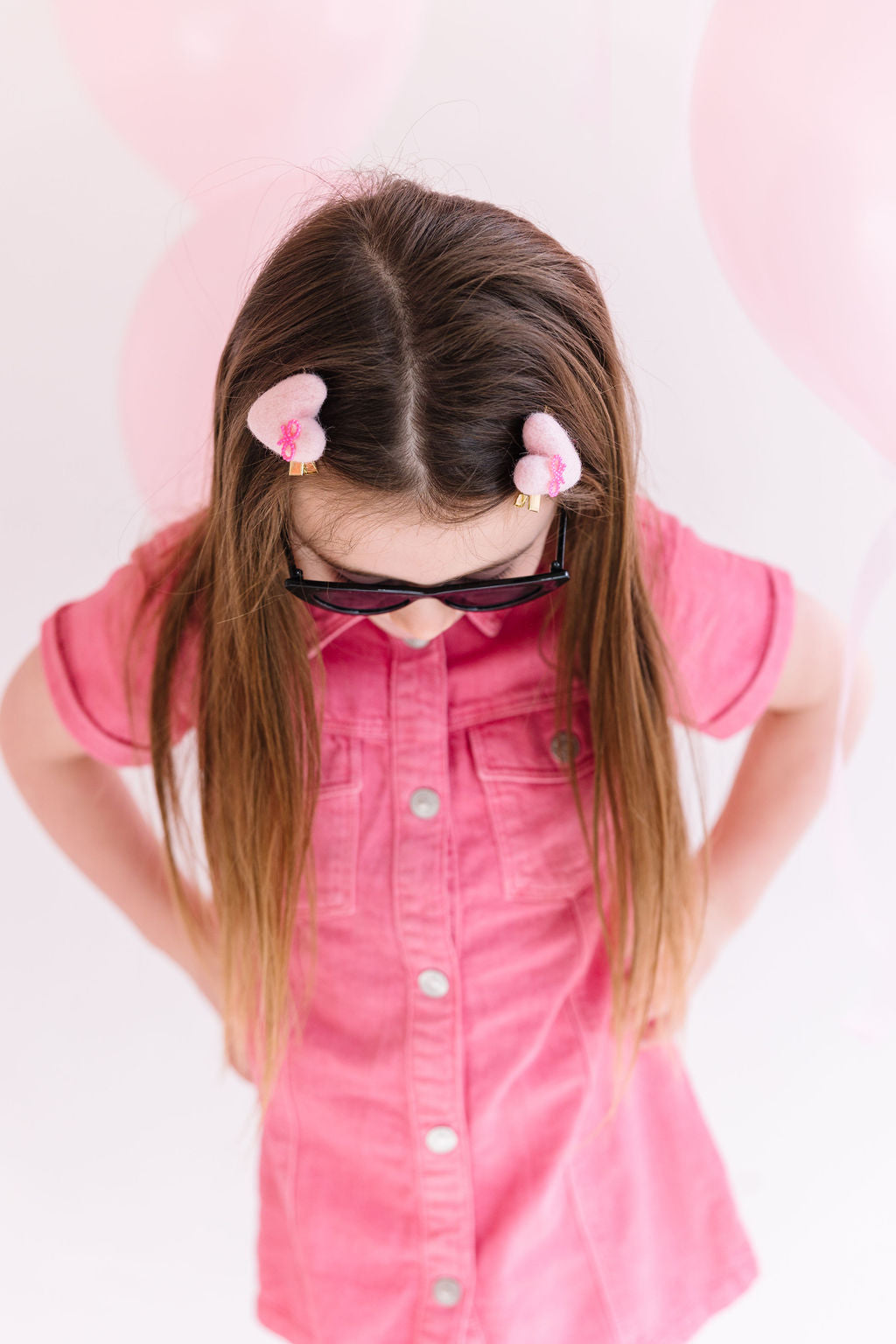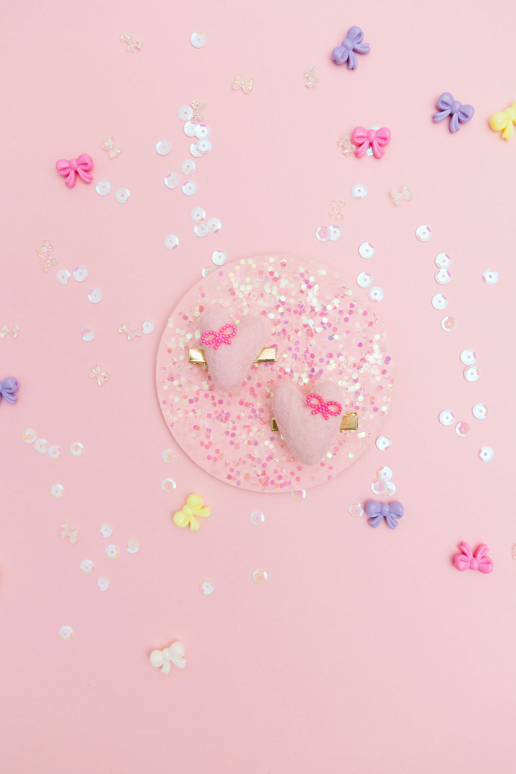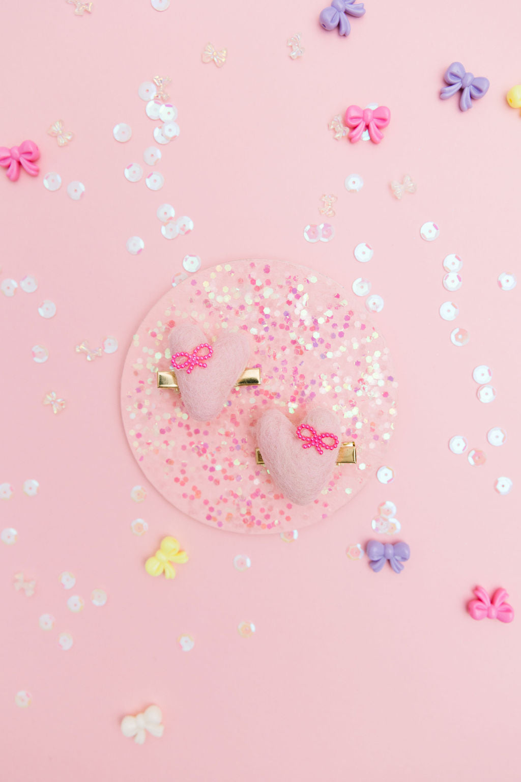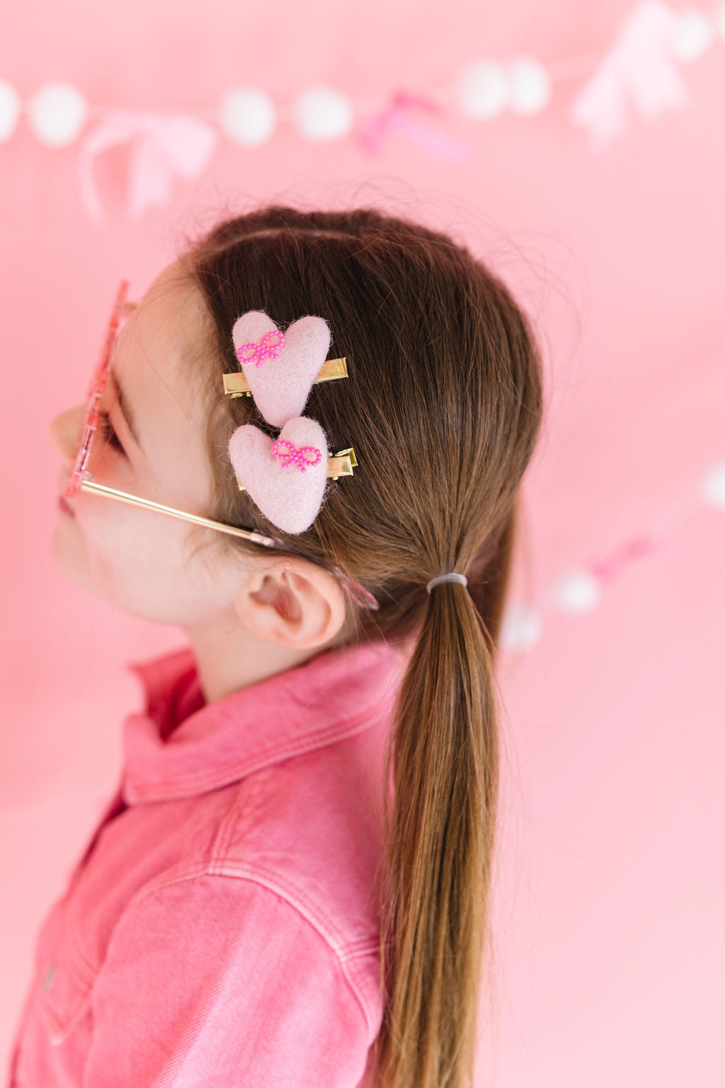 This listing is for 2 felt pink heart clips. Each heart clip comes with a ombré bow charm attached. You will receive one left clip and one right clip to be worn as pigtails. You can also stack these clips.