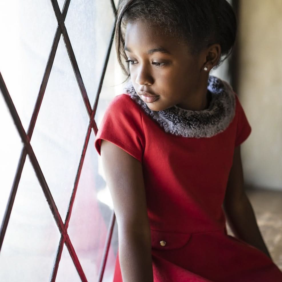 She'll be ready to twirl in our soft organic cotton ponte fit and flare skater dress. Features a festive faux fur collar, cap sleeves, and decorative front pockets with gold button detail.