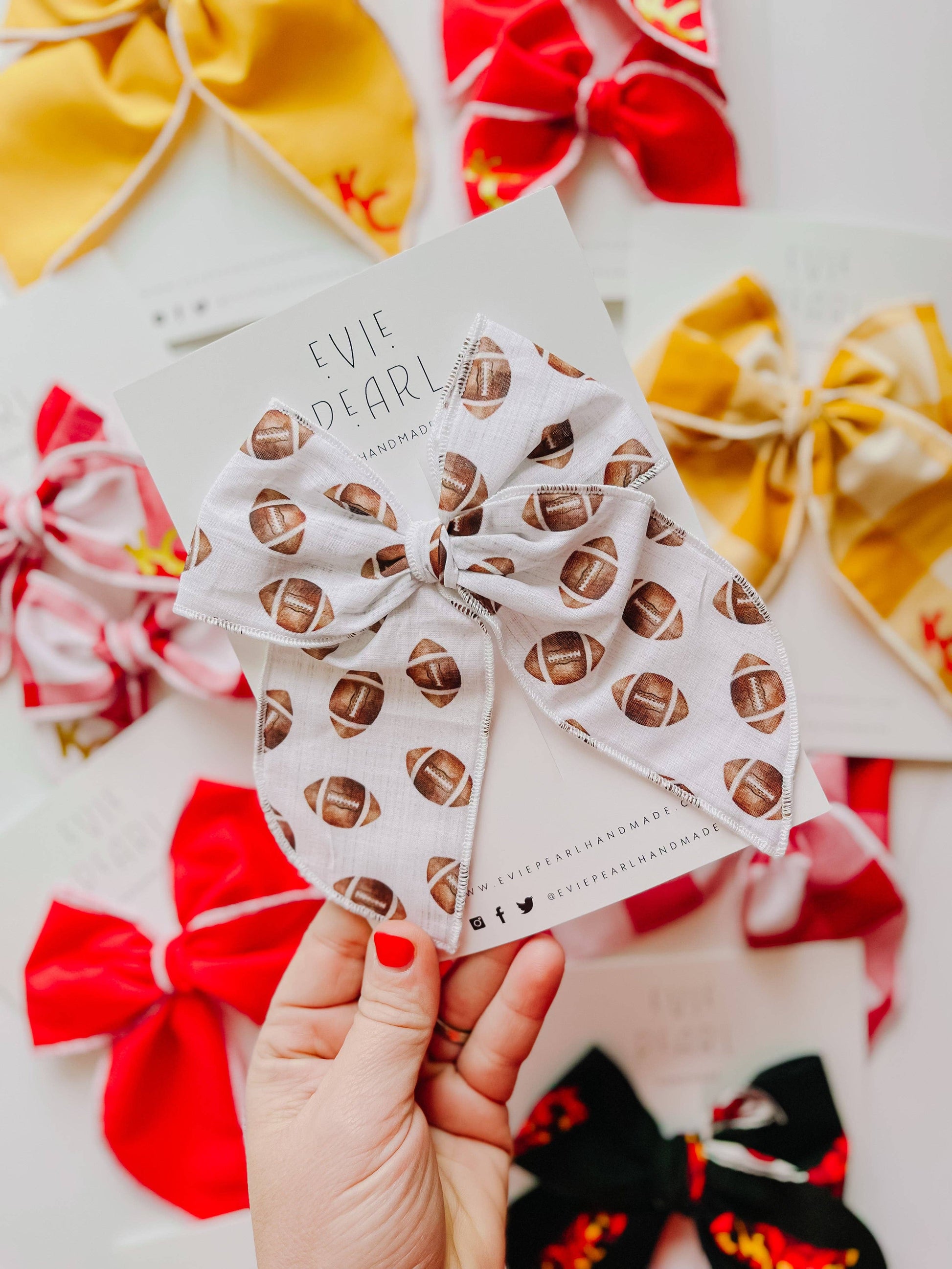Show off your Chiefs pride with our Kansas City Chiefs themed handmade hair bows, crafted with the utmost attention to quality and detail. Made from high-quality fabric, these hair bows are perfect for fans of all ages. Available in one size: oversized—these bows add a touch of team spirit to any hairstyle.