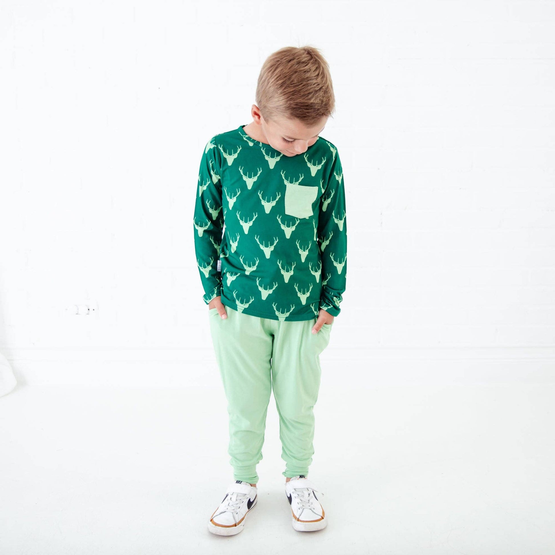 With contrasting shades of green, this collection gives all the outdoorsy vibes! Made with the same soft and stretchy bamboo viscose as our convertible footies, this long sleeve pocket tee and jogger set is the perfect daywear set for your favorite toddler or big kid! These comfortable solid jogger pants feature pockets and an adjustable drawstring. The split hem pocket tee is designed with an adorable pocket and a little extra length on the backside, for a super comfy fit and ultra cool look.