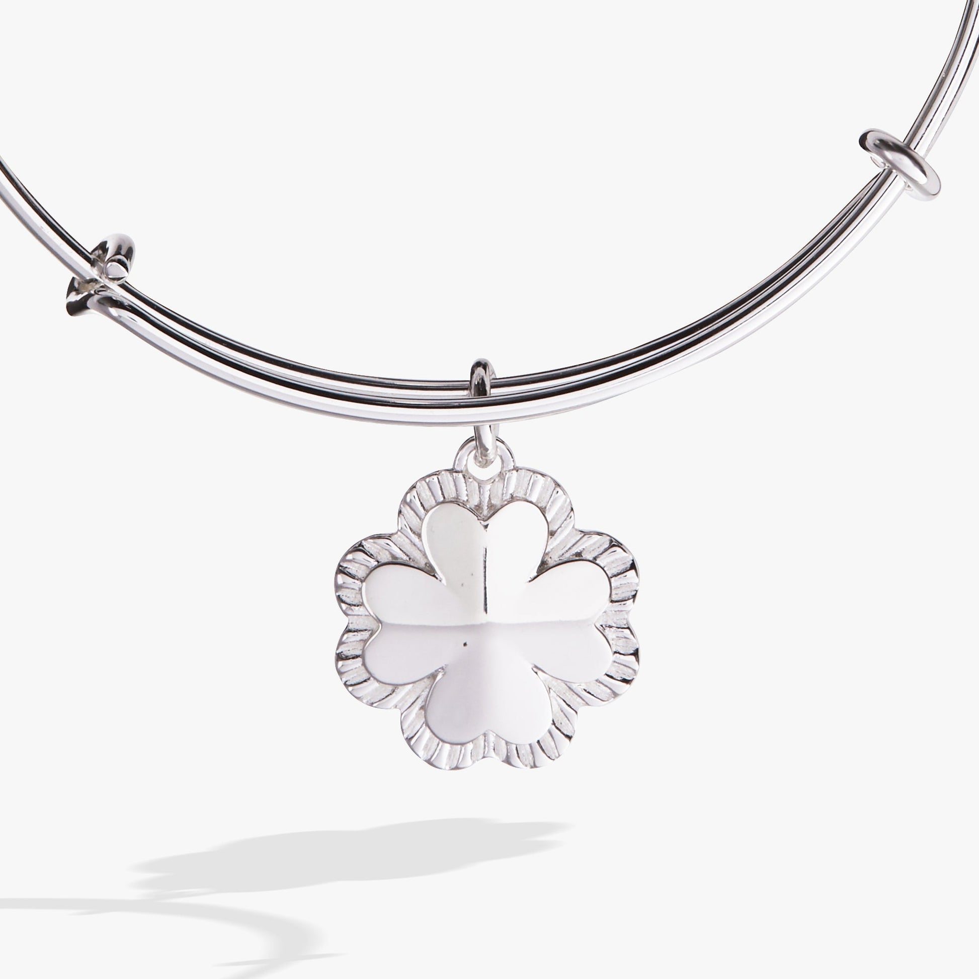 An ancient Celtic symbol of good fortune, the four-leaf clover represents a serendipitous blessing, said to bestow good luck on the person who finds it. This Four-Leaf Clover Charm Bangle features a two-sided charm on an expandable wire bangle bracelet. On the front there’s a dimensional four-leaf clover. On the back it says “Lucky You” with a lucky horseshoe. Wear it as a reminder that you manifest your own luck.