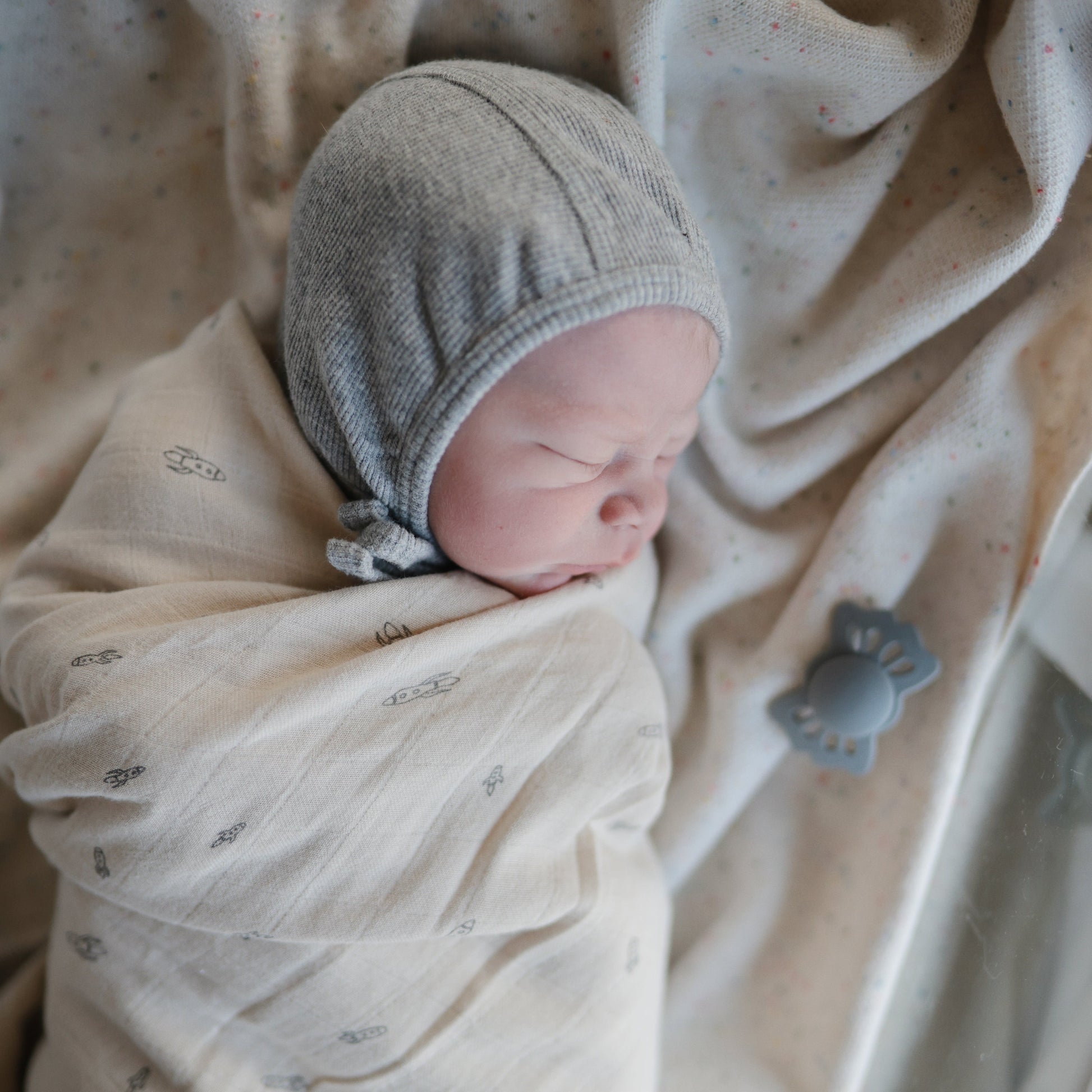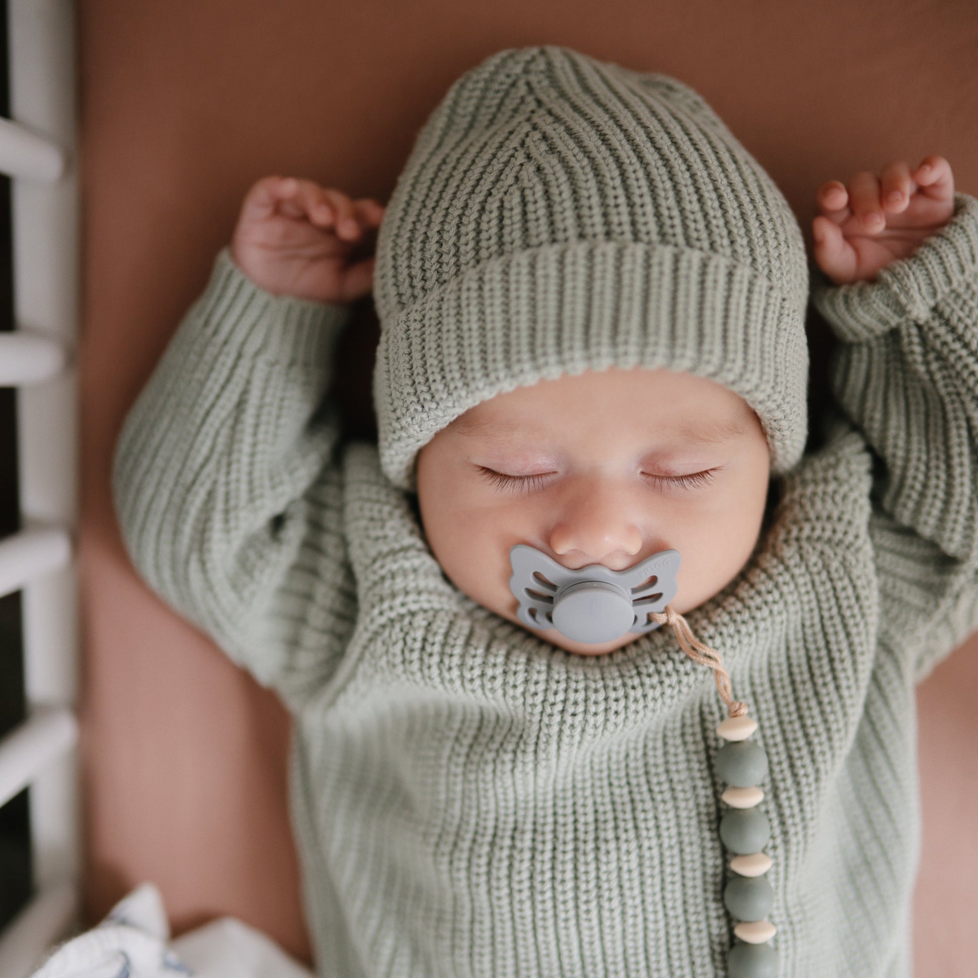 FRIGG Lucky is symmetrical with a slightly flattened teardrop-shaped nipple. The symmetrical design always fits correctly in baby’s mouth, regardless if it is facing up or down. FRIGG Lucky pacifiers have a flatter neck to minimize pressure on the palate and gums, which reduces the risk of crooked teeth and supports proper development of baby’s mouth and jaw.