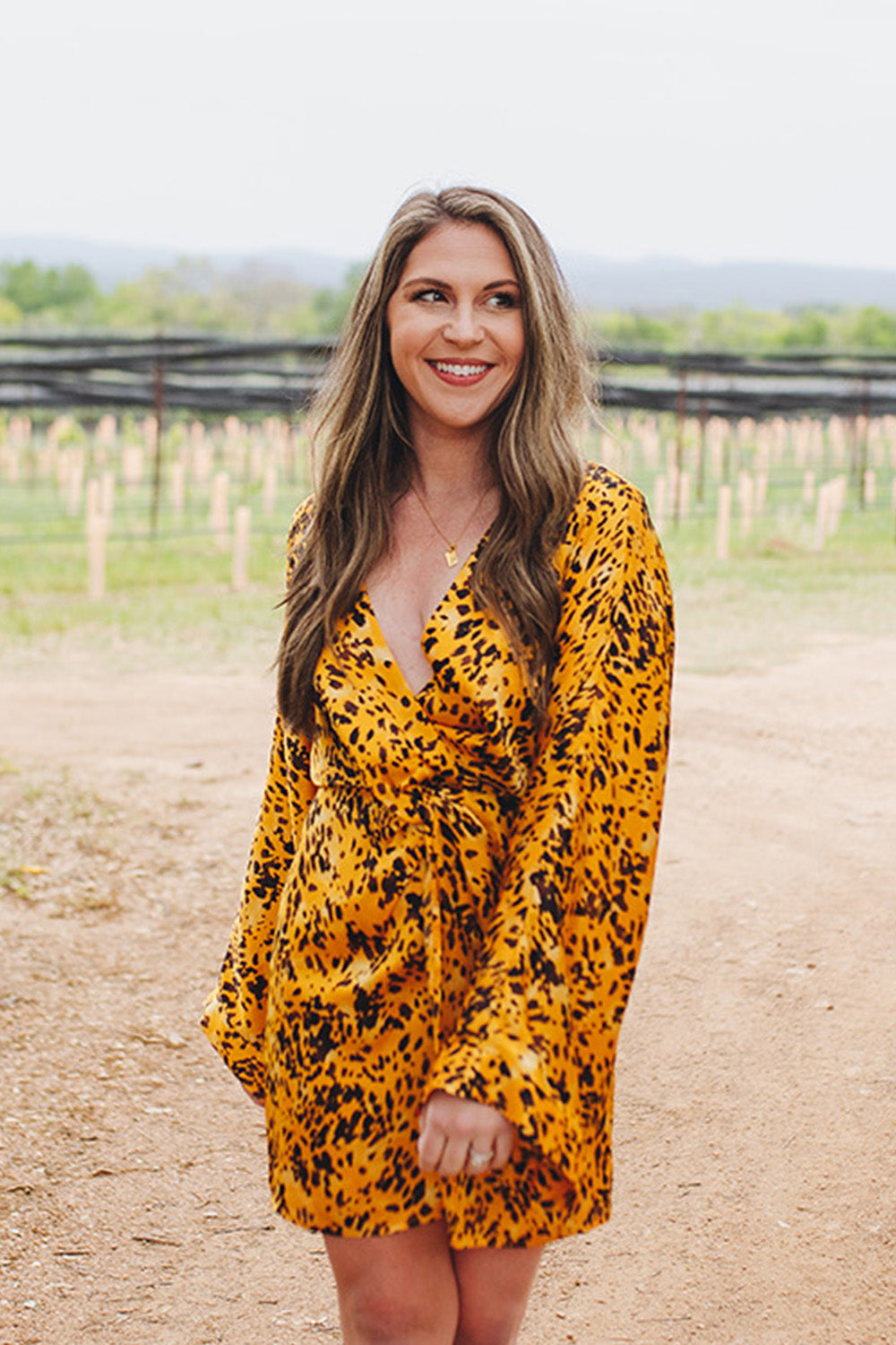 Our Gabriella Dress features a surplice neckline with button closure, elastic waist with a knotted detail, kimono sleeves, zipper closure on the back, and a semi open back with button closure! Pair her with heels and layered gold necklace to complete your outfit!