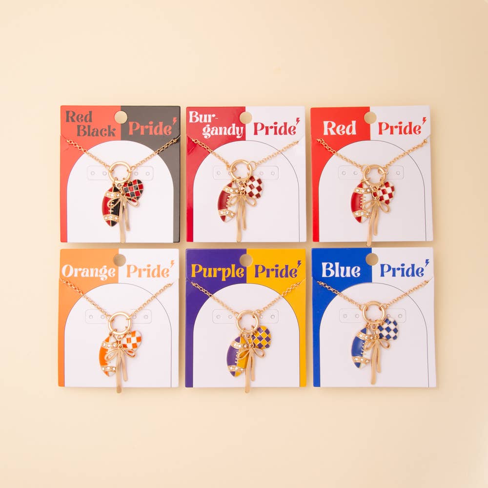 Celebrate team pride in standout style with this game day multi-charm necklace, featuring a spirited mix of enamel, crystal, and metal trinkets that capture the excitement of the season. From helmets to hearts, megaphones to paw prints, each charm adds personality and color to the bold chain silhouette. Lightweight yet eye-catching, it’s designed with a secure clasp and adjustable length for easy layering.