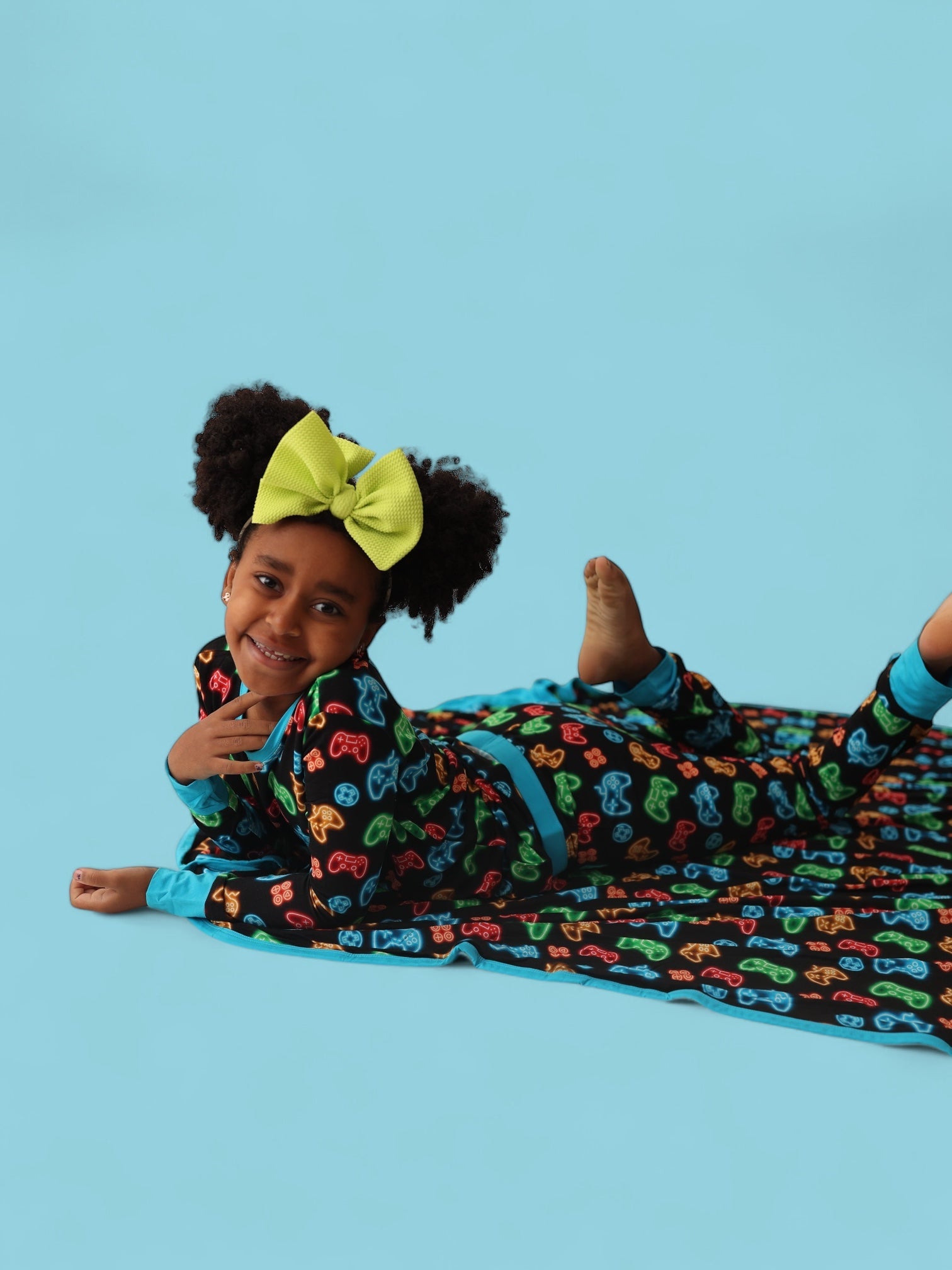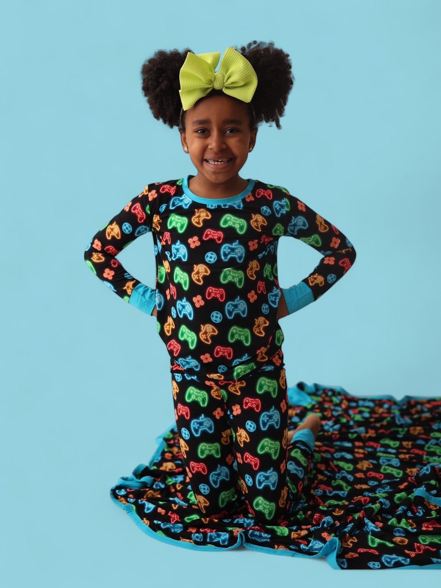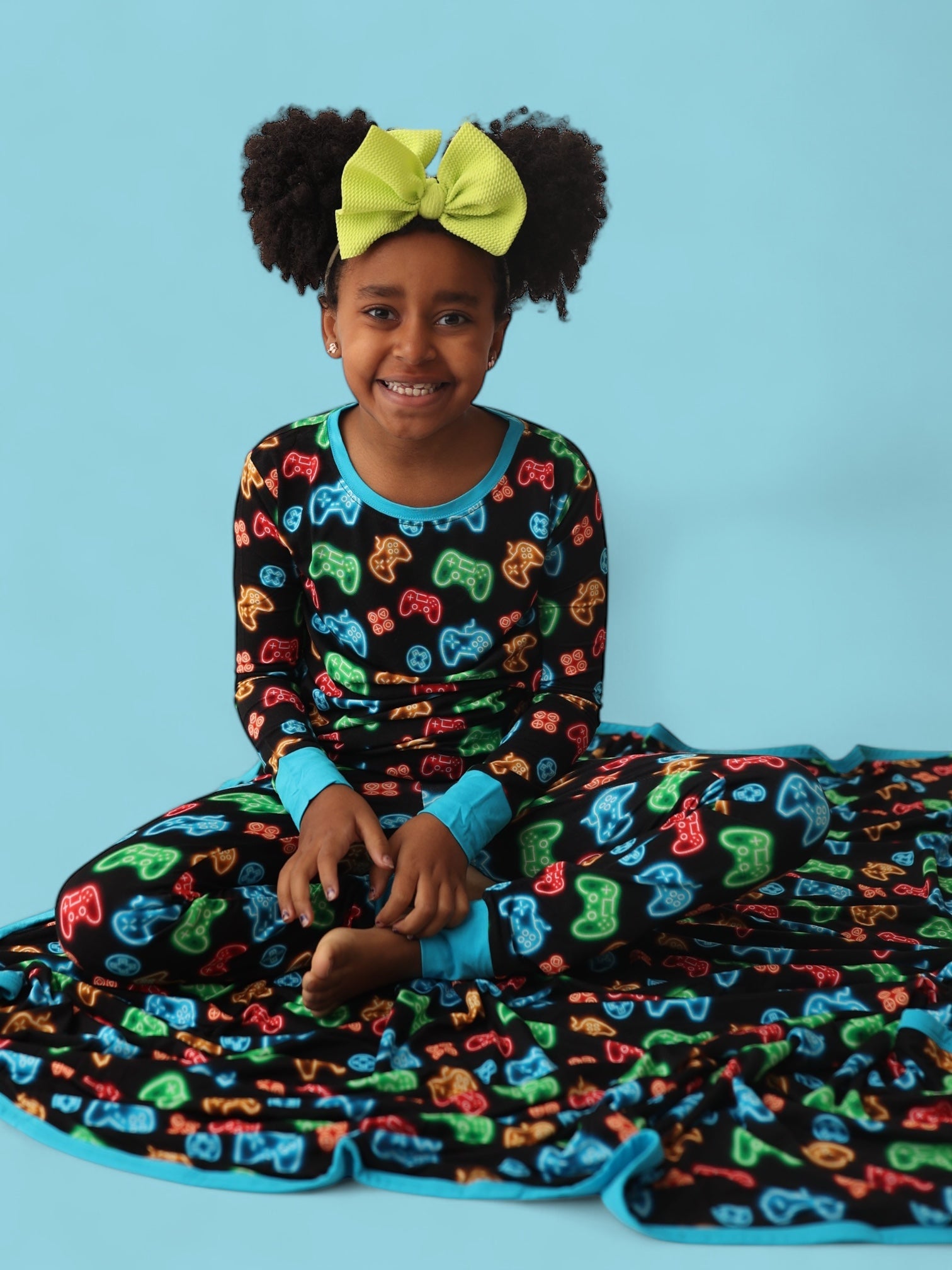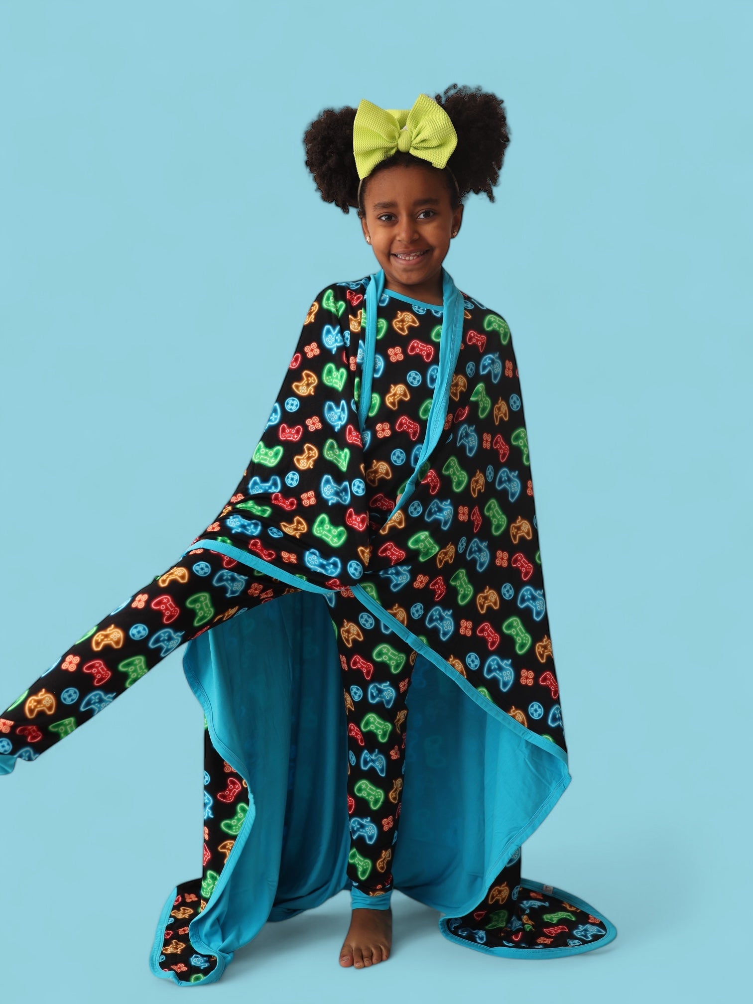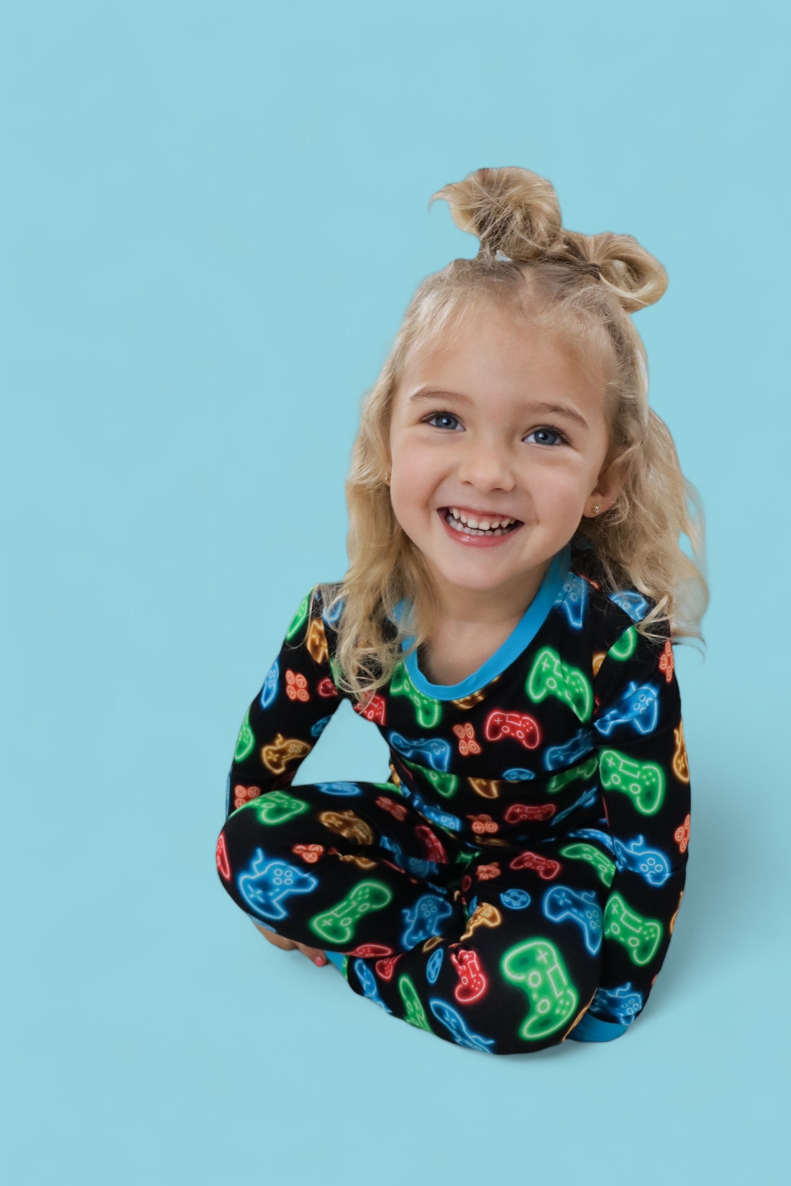 Power up bedtime and playtime with the Gamer Glow Dream Set—the ultimate outfit for your mini gamer! Featuring an all-black base with neon game controllers in vibrant shades of pink, green, orange, and blue, this set is sure to take the gaming world by storm. Whether they’re conquering bedtime boss battles or leveling up their dream adventures, this set is a total win!
