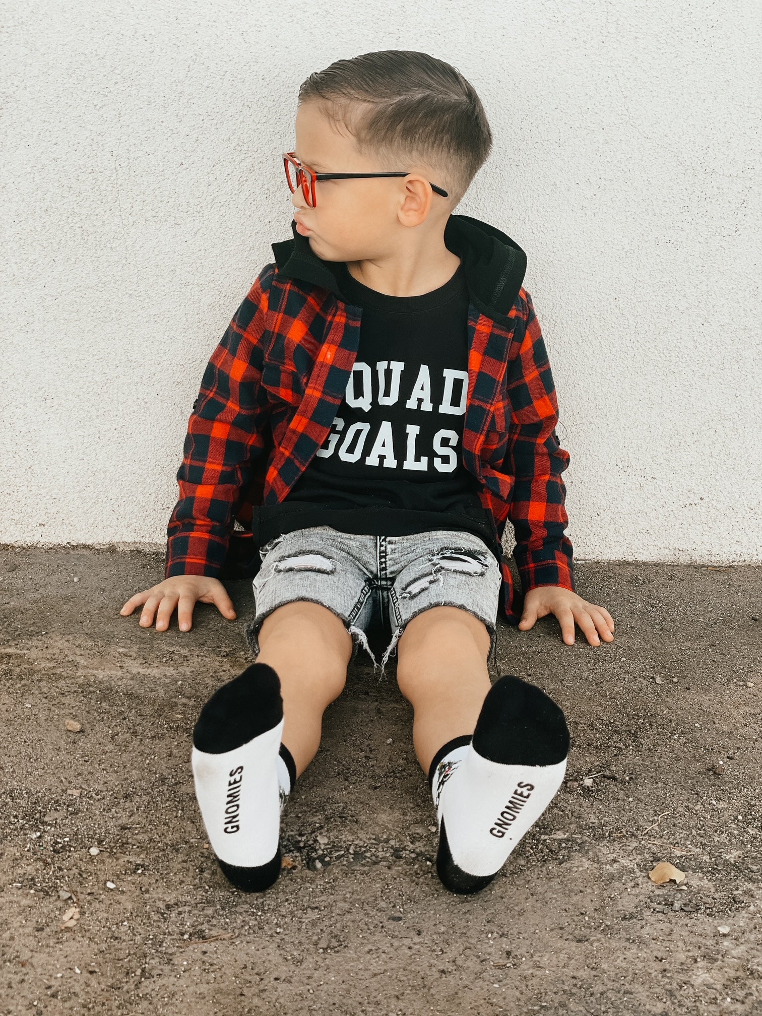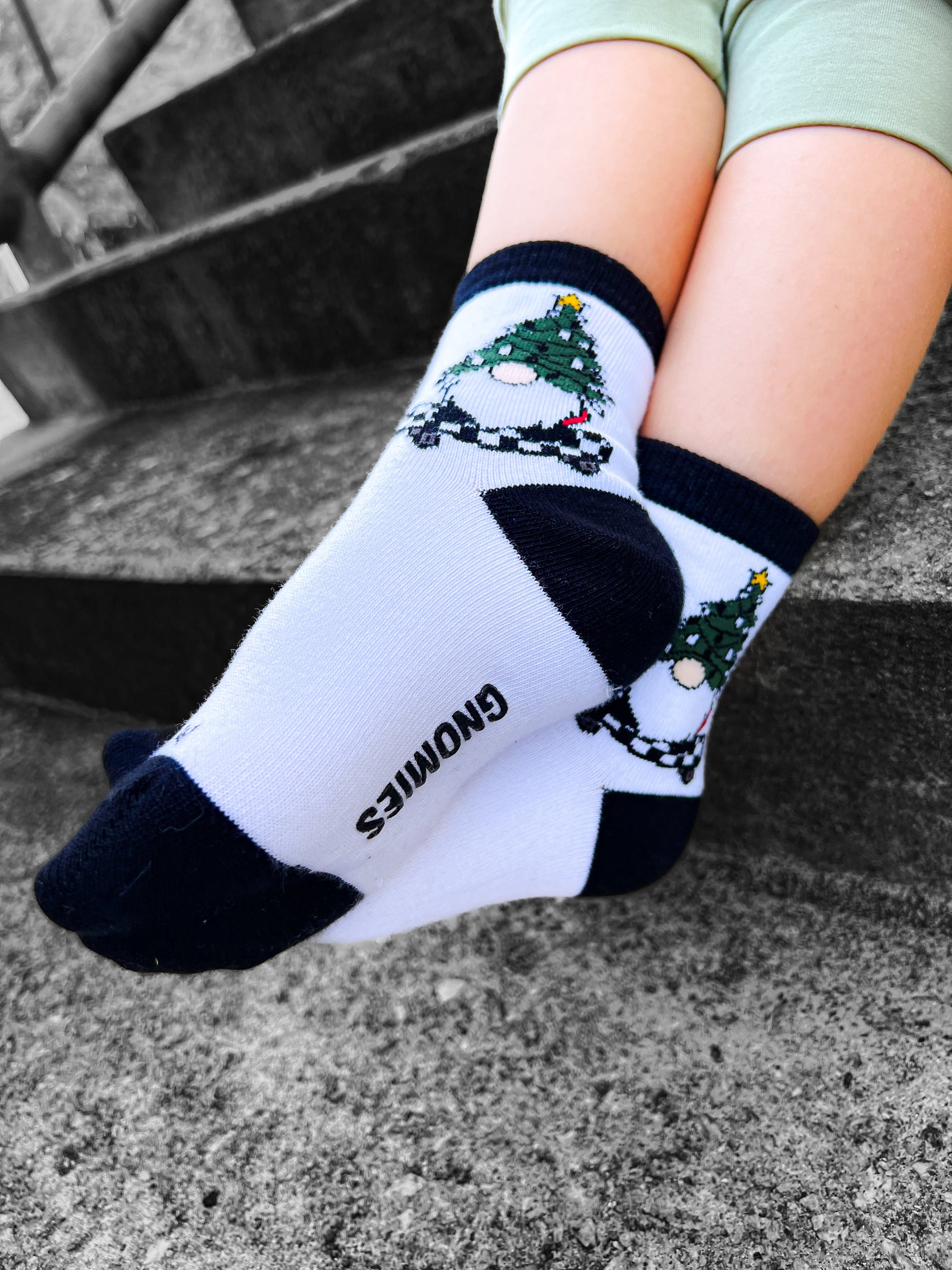 Sizes Infant/XXS, Extra Small, Small + Medium have "Gnomies" grips on the bottom of the feet and size large have a stitched "Gnomies" on the bottom of the feet.