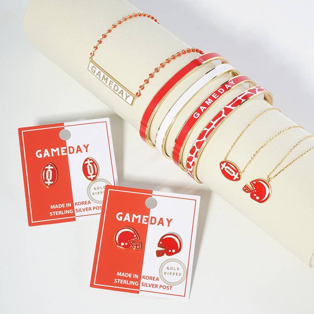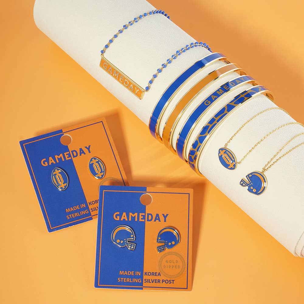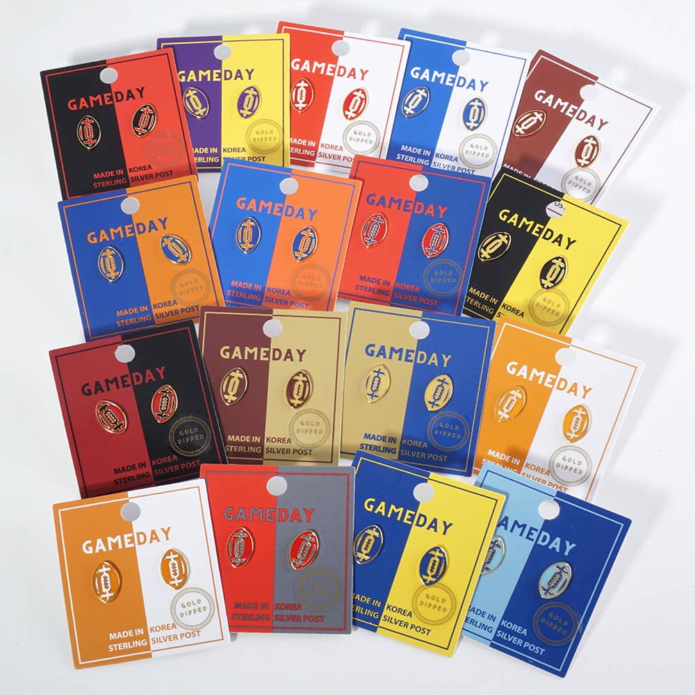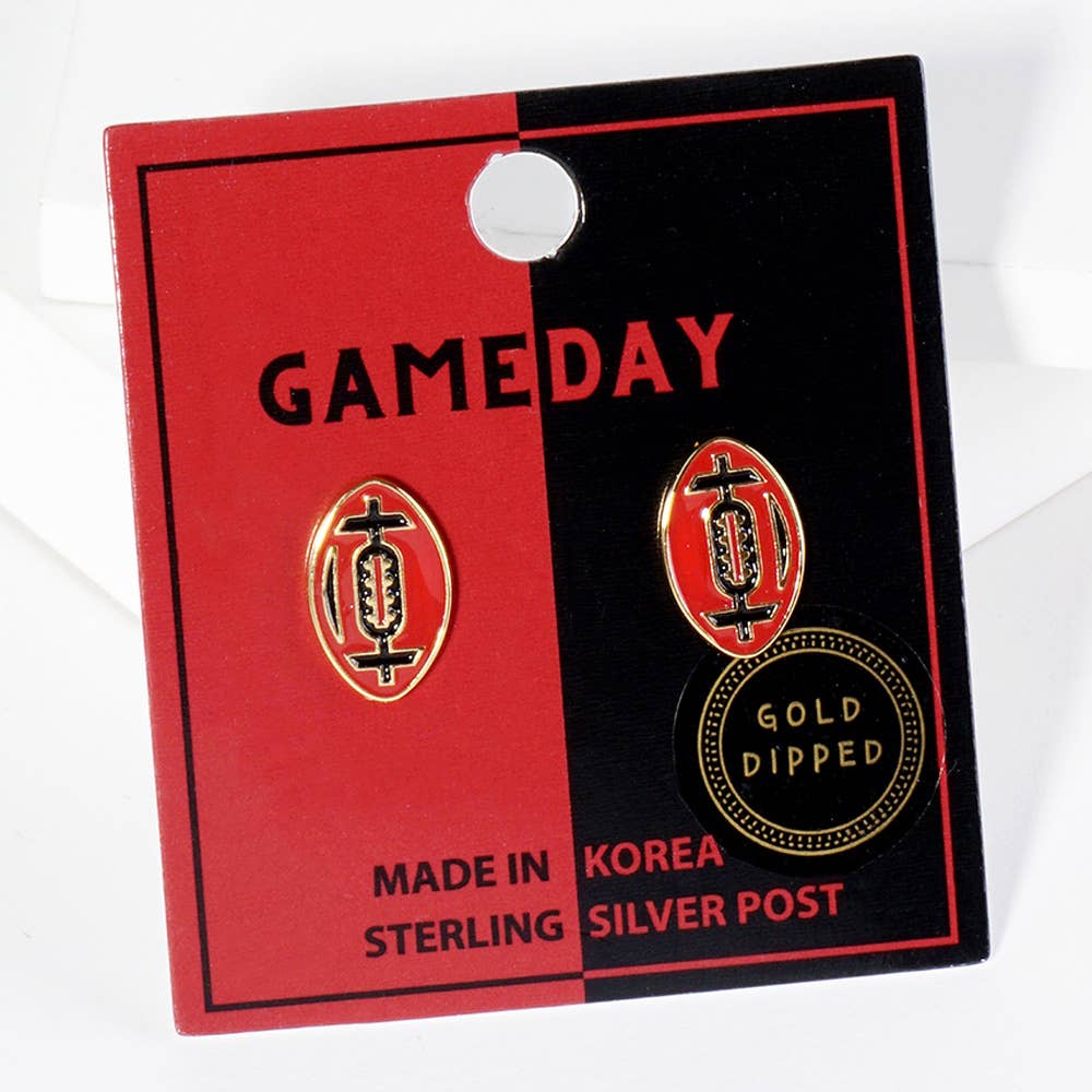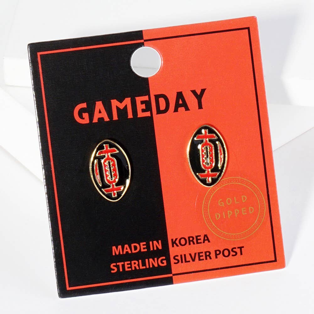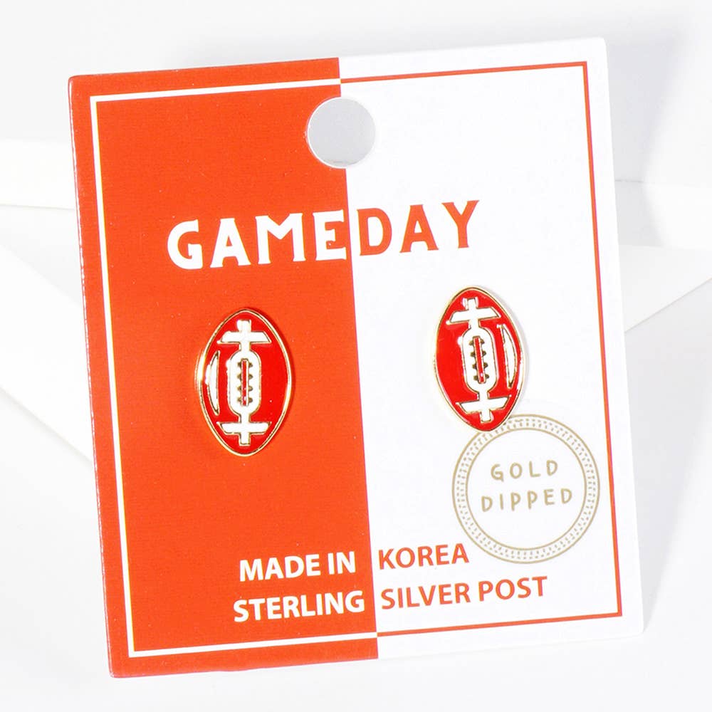 Show your team spirit with these gold-dipped football stud earrings, featuring a vibrant enamel finish and sterling silver posts. Lightweight and game-ready, they're the perfect accessory for tailgates, sports events, and fan outfits.