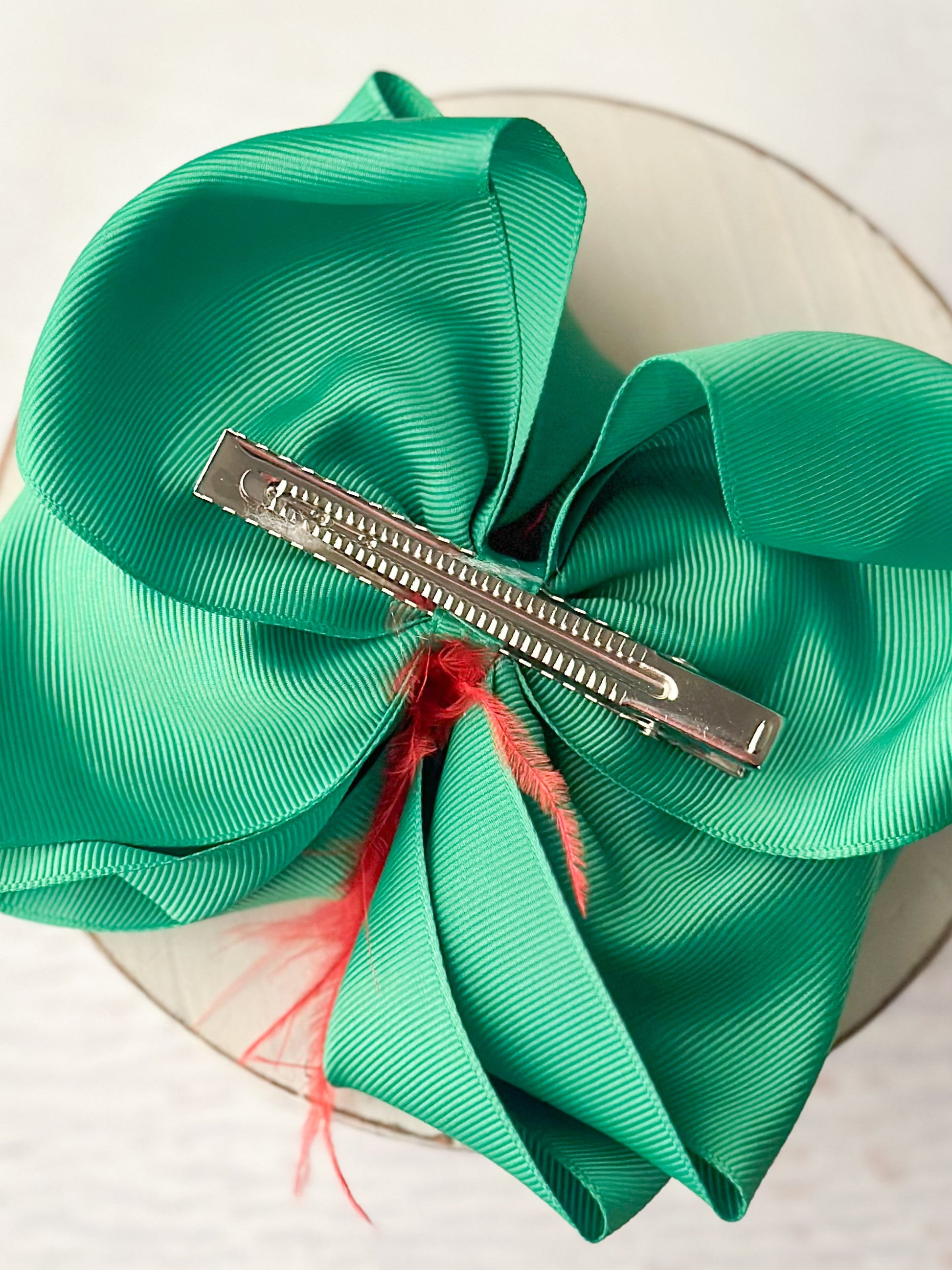 A large double looped bright Emerald green grosgrain ribbon hair bow with a red fluffy ostrich puff center. Attaches with a large 3" alligator clip with "teeth" for a secure hold. The bow measures approximately 6.5" long and 5" wide.