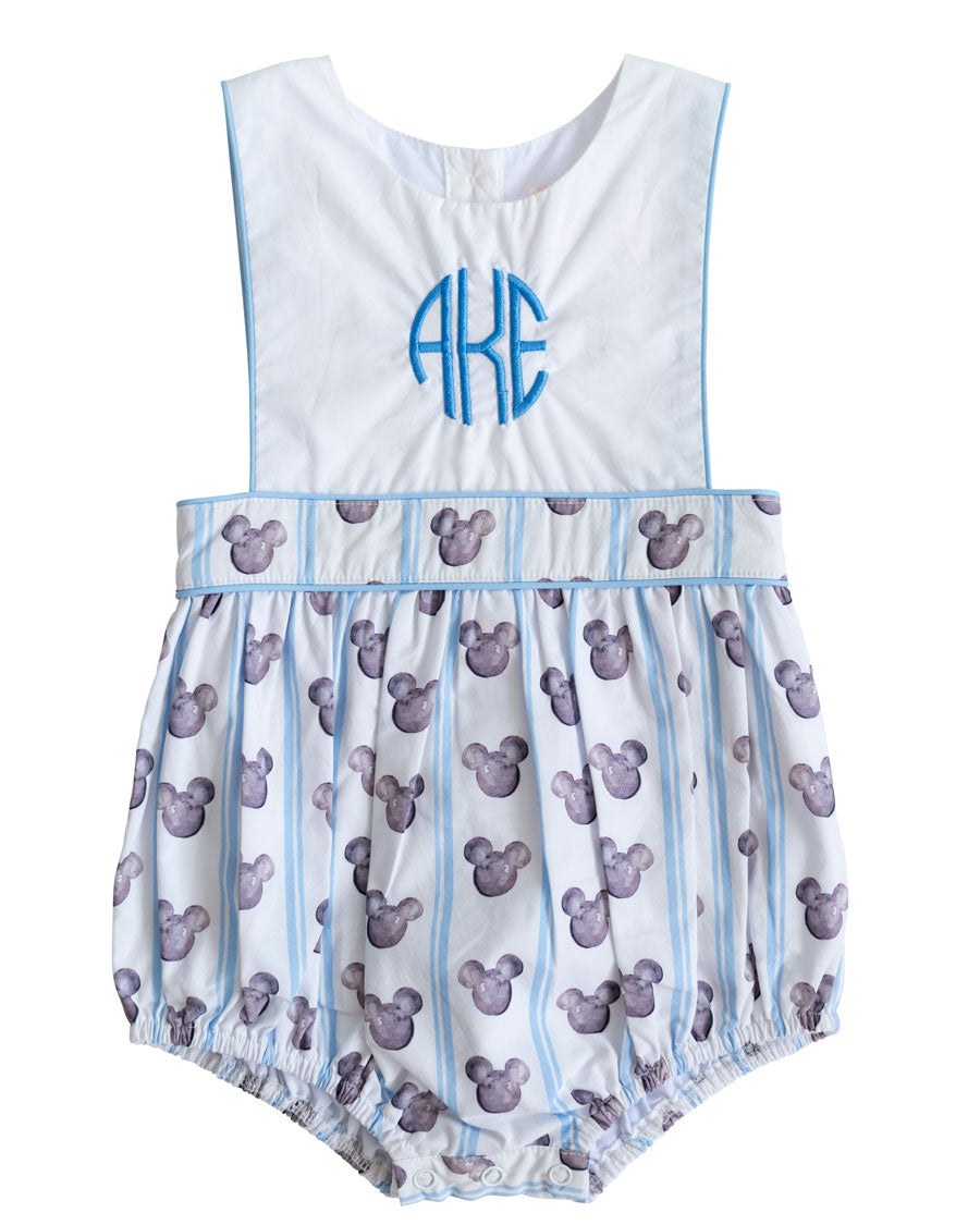 Memories are sure to be made in this darling Hand Painted Mouse Print with Blue Stripes bubble. Perfect for the parks, this bubble is lightweight with snaps in the stride for easy changing. Add a personal touch with a monogram to the center chest. 100% cotton