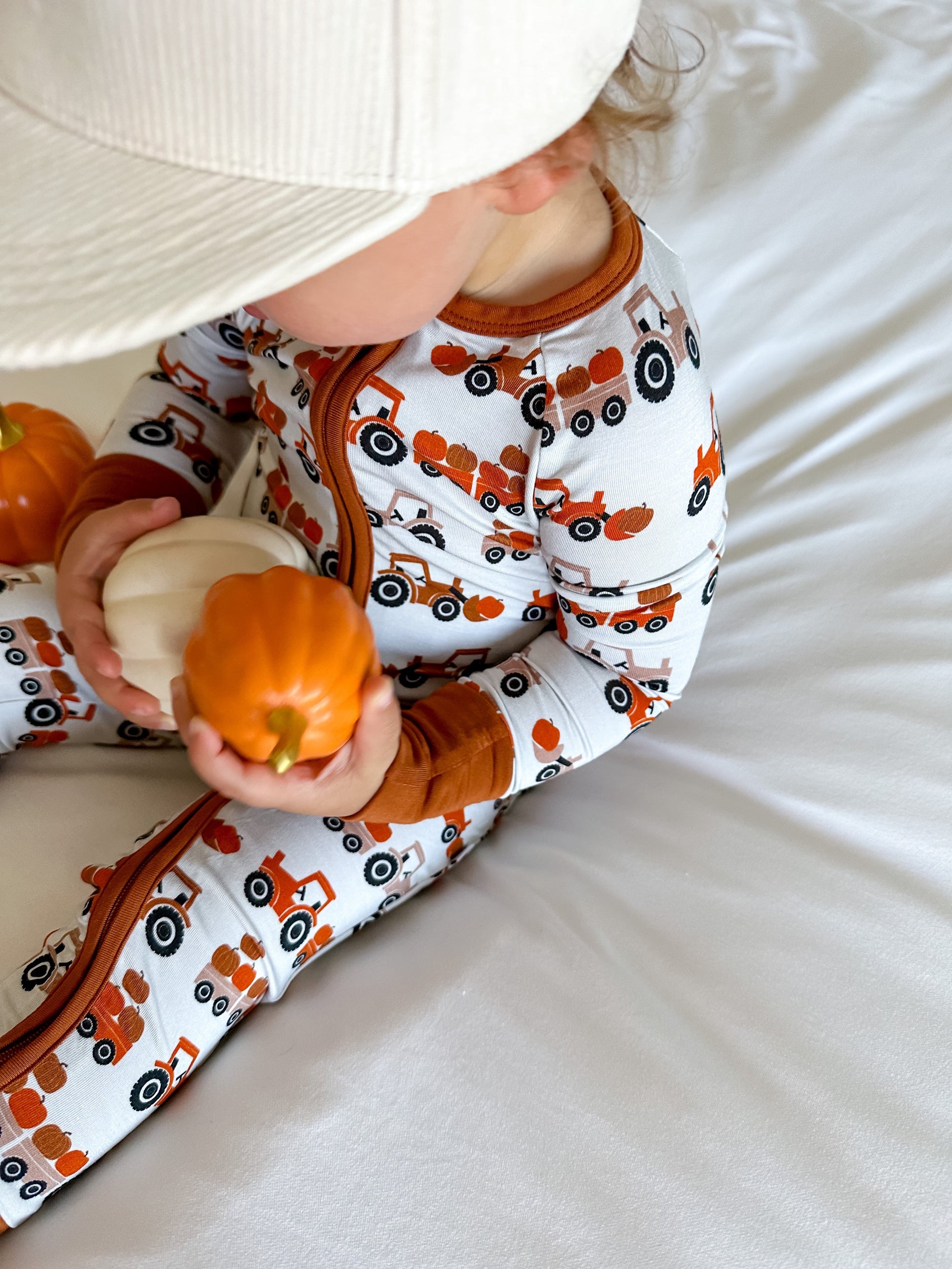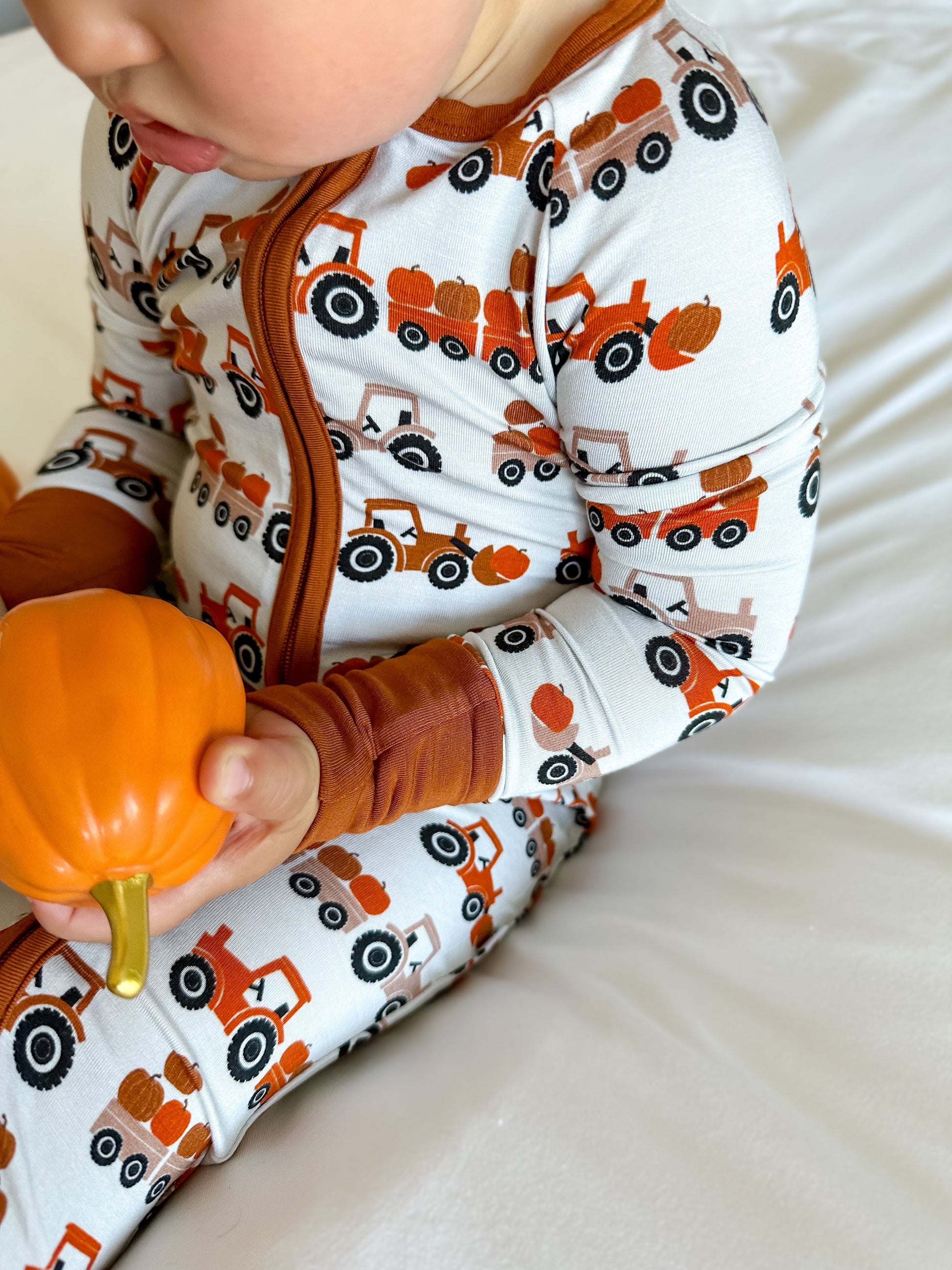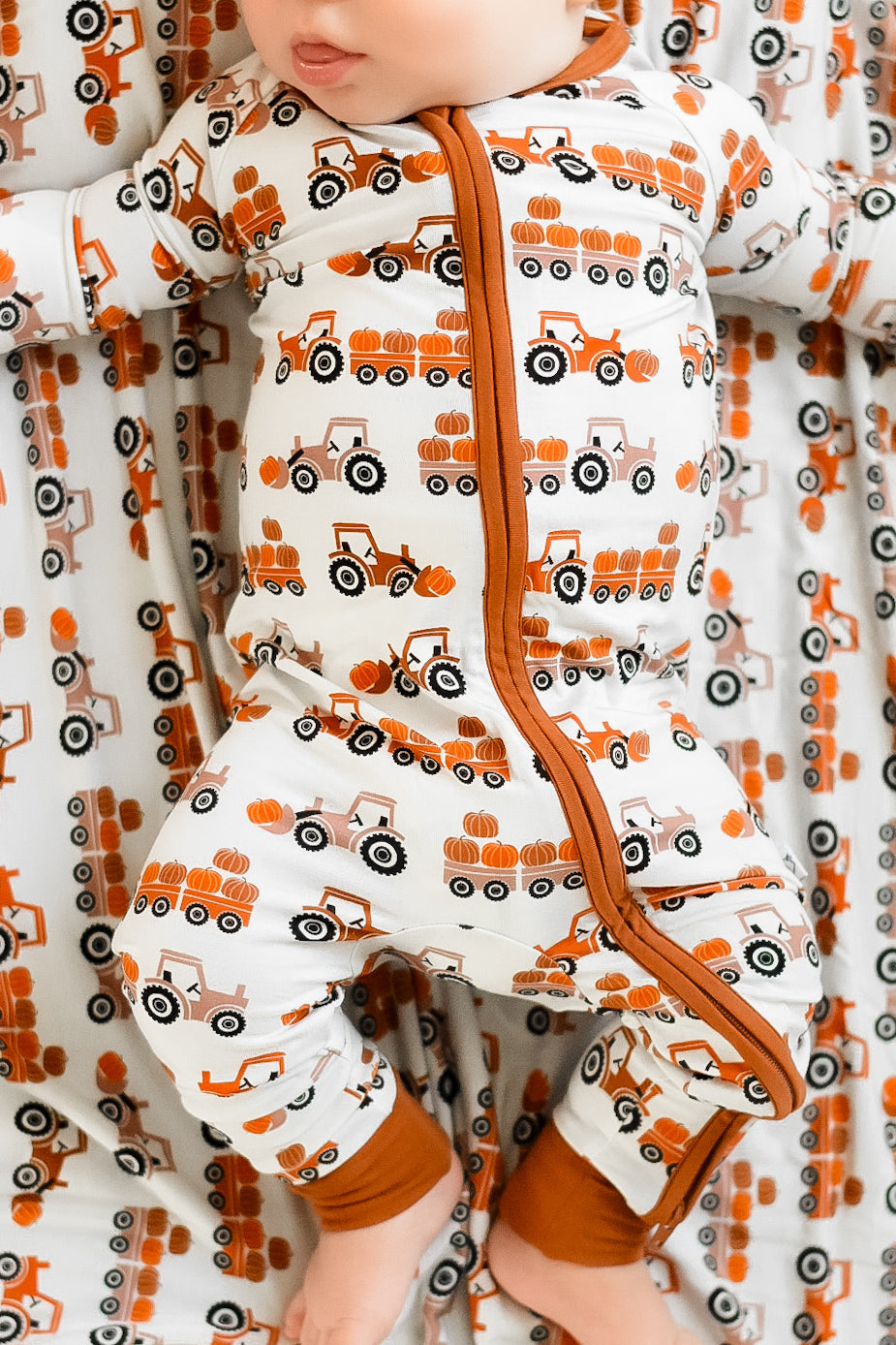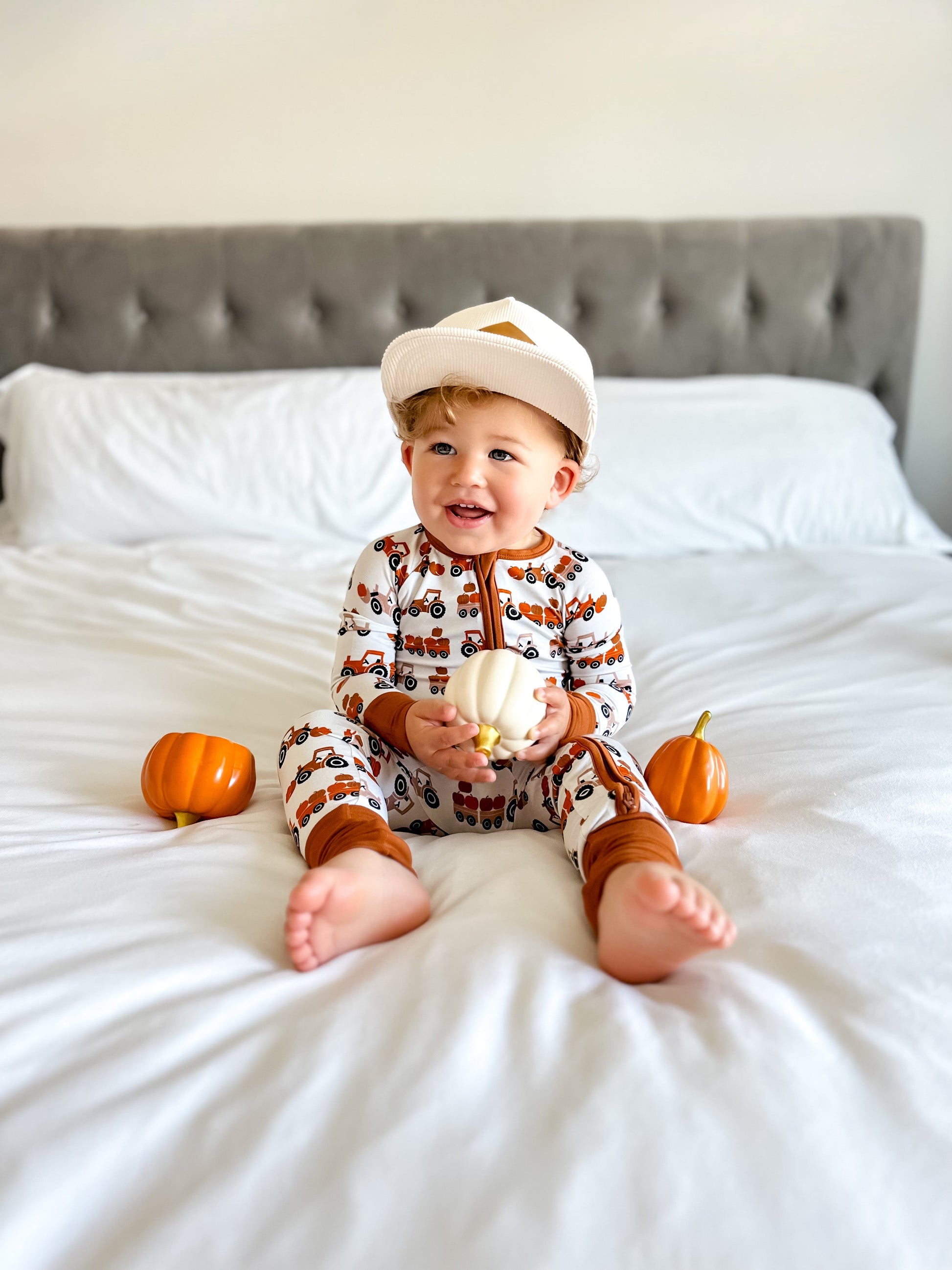 Dress your little one in this oh-so-cute 'Hay Pumpkin Dream Romper'! Perfect for your little pumpkin's hayride adventure, complete with a fun printed pumpkin design, long sleeve romper, zipper feature, all in a cozy bamboo material. Get ready to be the envy of the playground!