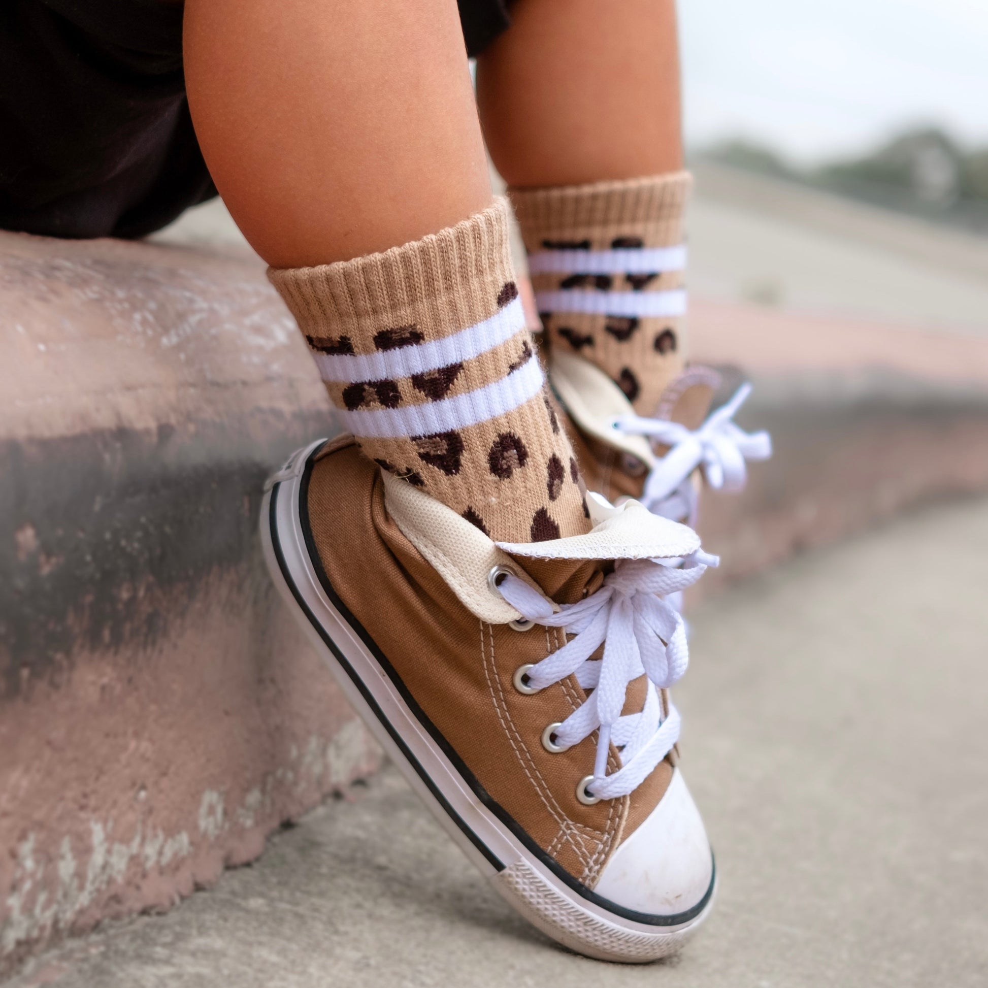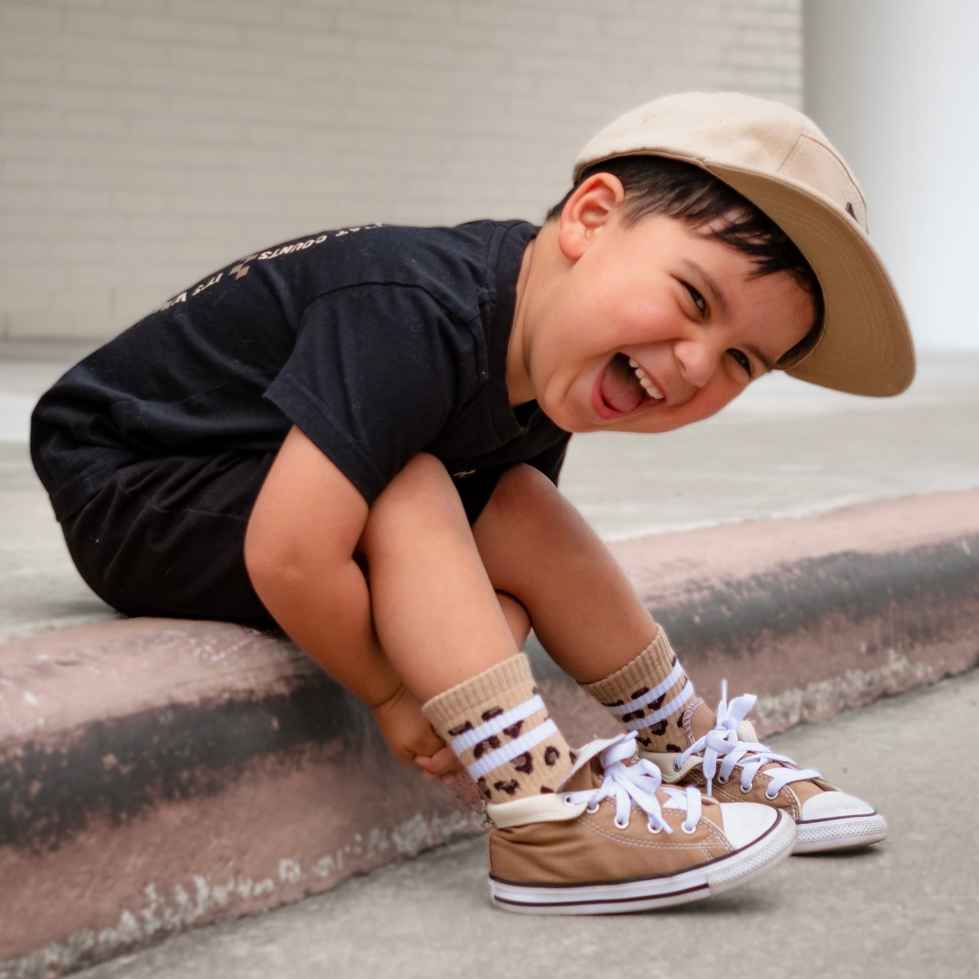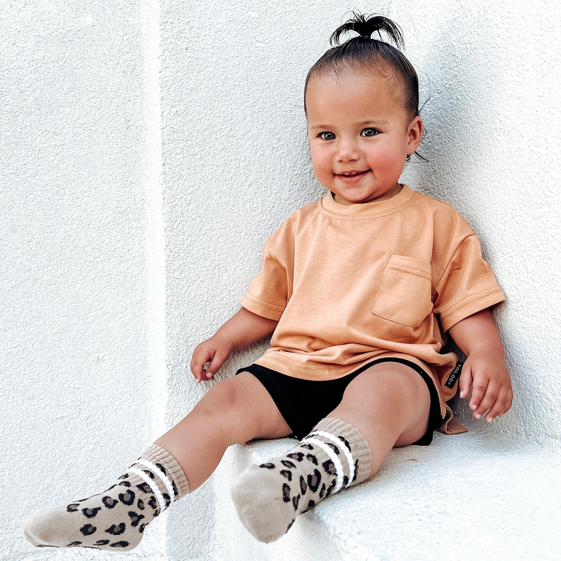Sizes Infant/XXS, Extra Small, Small + Medium have "Wild Child" grips on the bottom of the feet and size large have a stitched "Wild Child" on the bottom of the feet.