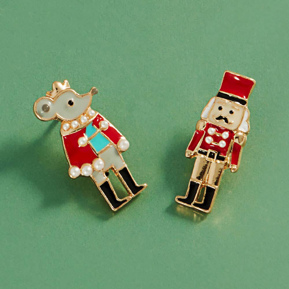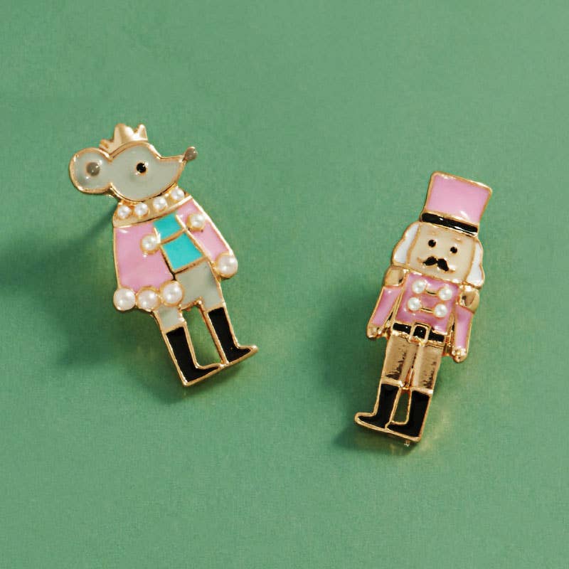 Celebrate the season with this charming earring set featuring a whimsical nutcracker and mouse king design. Ideal for holiday outfits, themed events, or as a playful gift for fans of festive classics and ballet-inspired accessories.