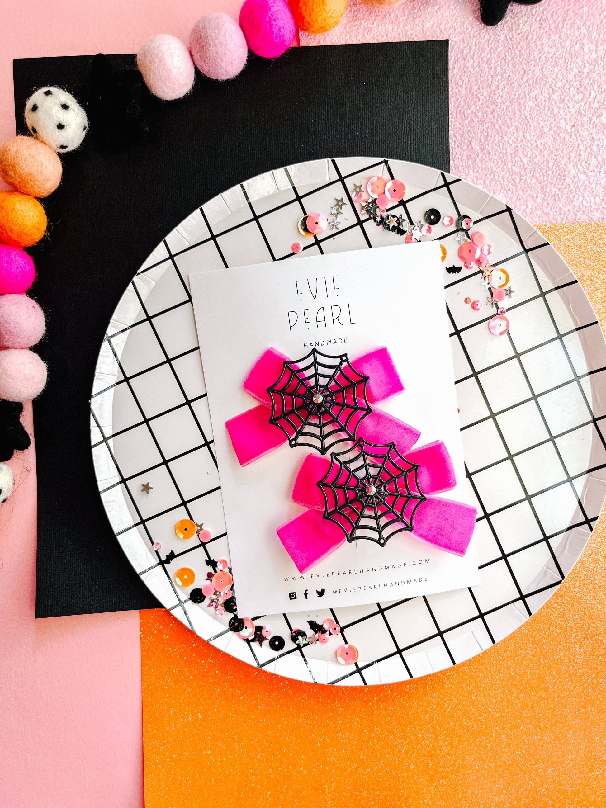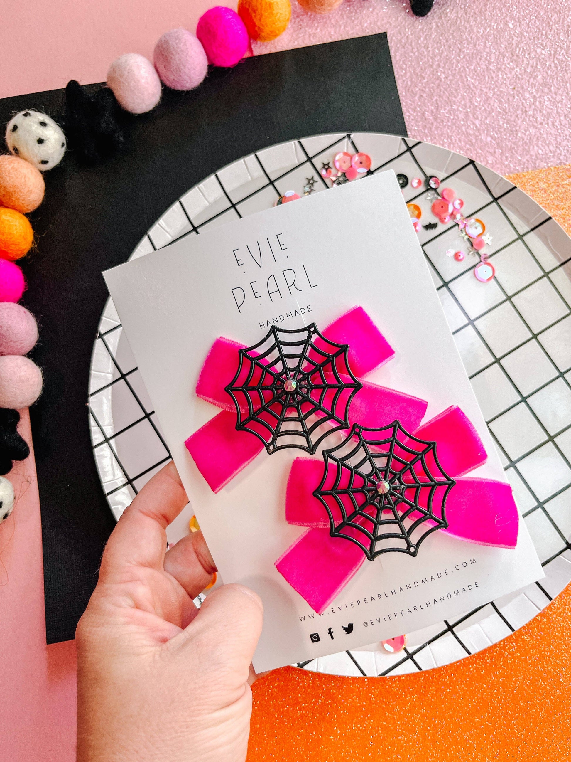 Spooky meets sparkly with our hot pink velvet pigtail bows! Each bow is topped with a black spiderweb charm and finished with a rhinestone pink accent for just the right amount of Halloween magic. This set includes one right-side and one left-side alligator clip, designed to grip all hair types—thin, thick, or anything in between—without slipping.