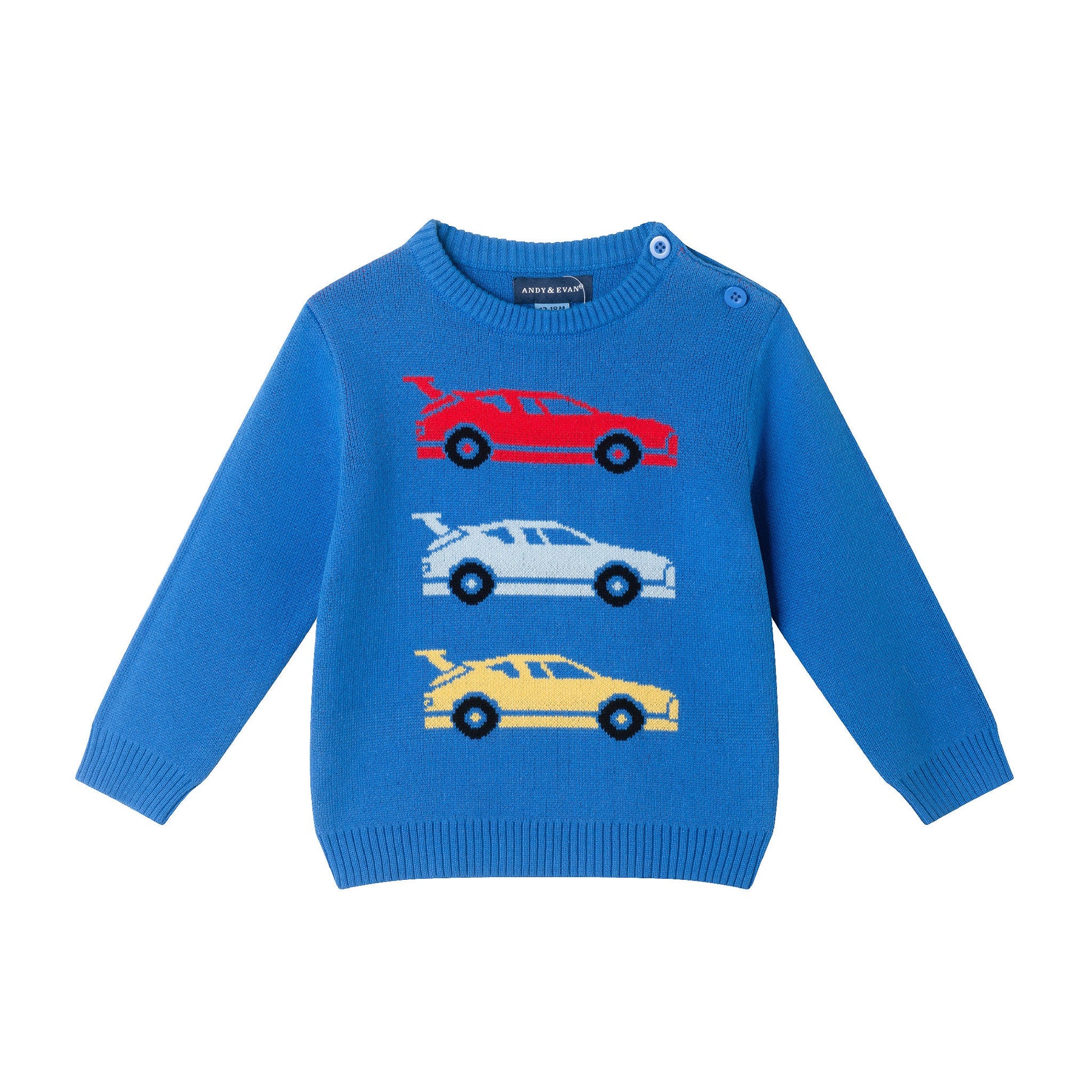 Start your engines โ this racecar-inspired sweater set is ready for cozy adventures! Featuring three speedy cars zooming across a bright blue knit pullover, this set pairs perfectly with comfy navy joggers that keep up with every crawl, scoot, or first step.