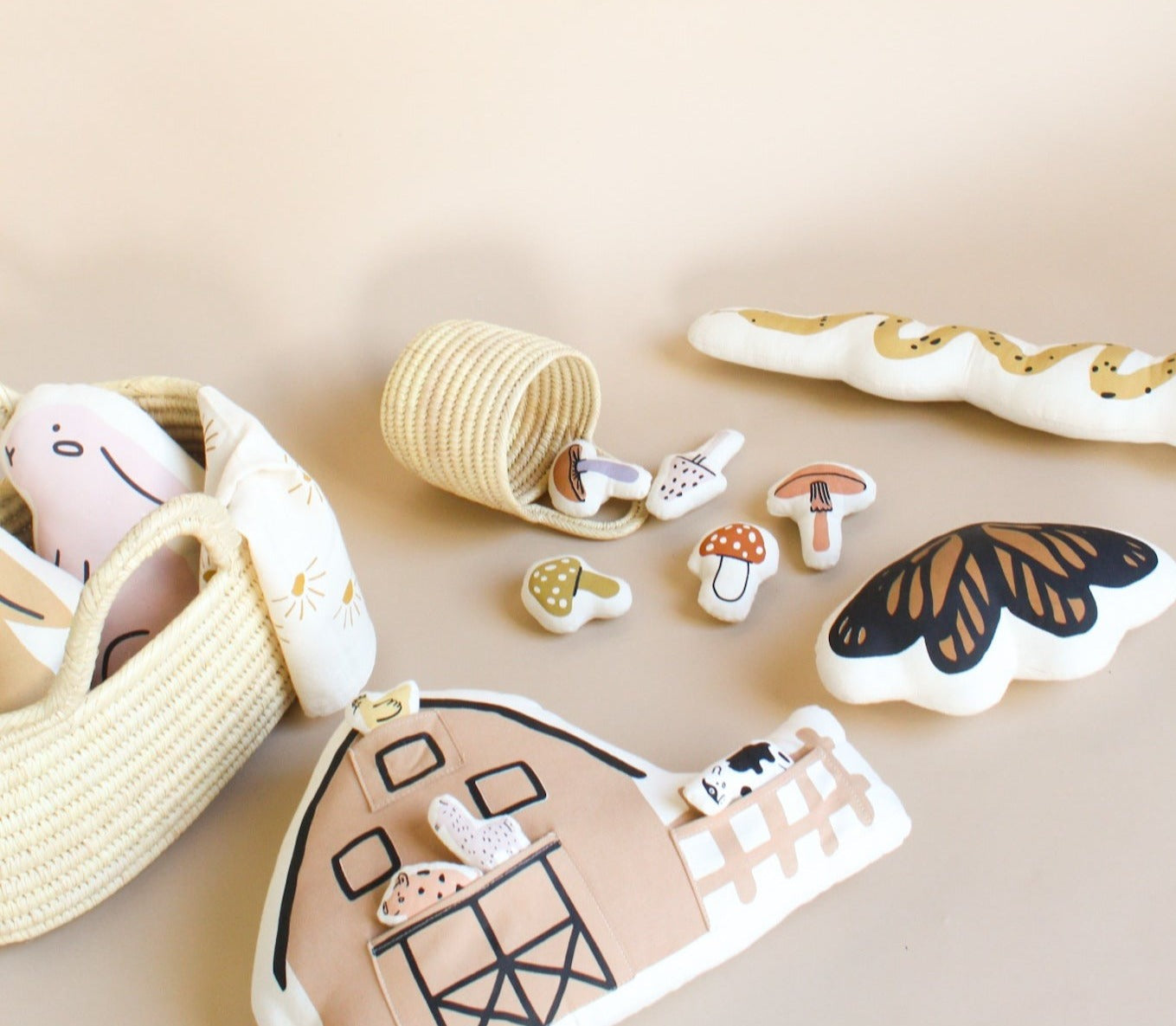 Our Farmhouse + Animal set will immerse your little one onto the farm and use their imagination. Our interactive barn comes with 4 little plush animals: a cow, a chicken, a pig, and a lavender llama. Sewn and screen printed by hand on natural canvas by Kenyan artisans.
