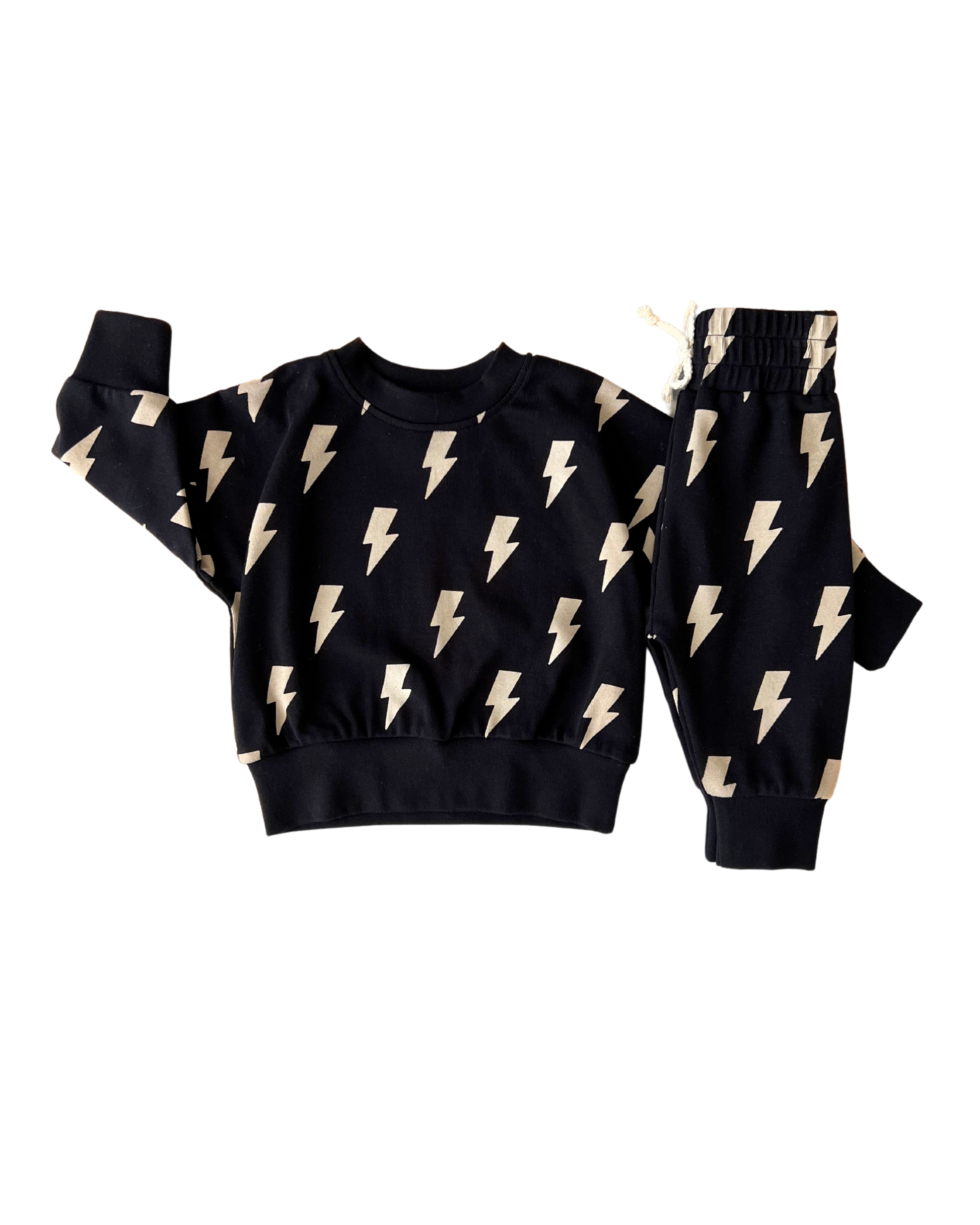 Your little one will look adorable and feel comfy in this playful set with bold bolts. This two-piece set is made of oh-so-soft cotton, perfect for daily lounging during any season! Stylish enough for a day out, cozy and comfortable for play. Gender neutral and up to 9Y, this rad and modern design will be your little one's favorite must-have!