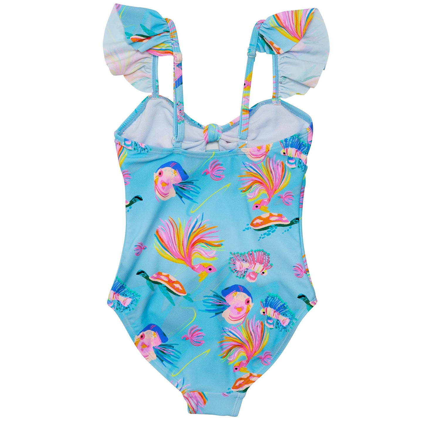 Dive into the fun wearing this frill swimsuit, featuring sustainably sourced fabric that's tough on chlorine but gentle on the planet. Adorned with playful frills and a cute bow at the keyhole, this suit is adjustable with clear plastic straps, making it perfect for young swimmers ready to make a splash.