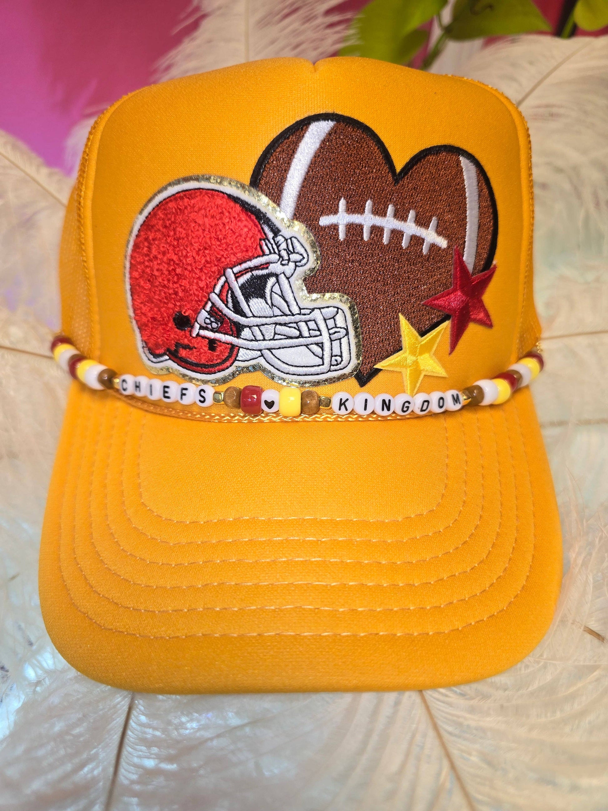 Show off your Chiefs pride with this vibrant solid yellow gold Otto Cap Premium trucker hat. Featuring a high crown foam front and a breathable mesh back, it keeps you cool while you cheer. The red chenille football helmet patch and heart football with star accents add a fun, playful touch. With a snapback closure and custom Chiefs Kingdom beaded chain, this hat is perfect for every Kansas City fan ready to stand out in the crowd.