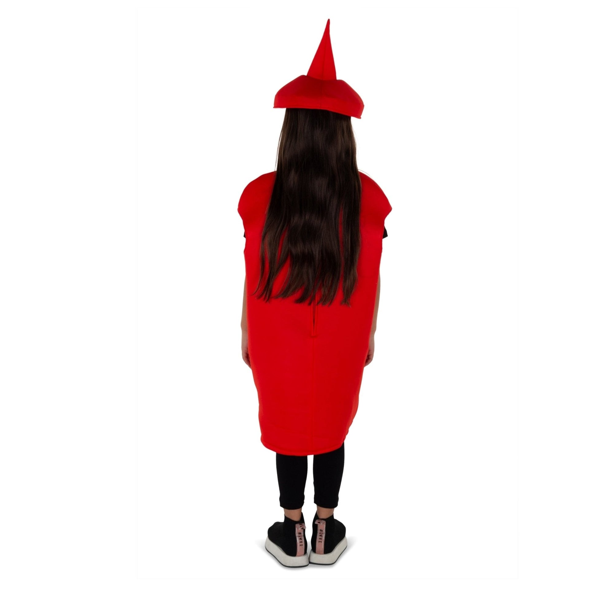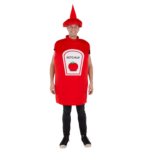 KETCHUP! THAT SAYS IT ALL! - dip 'em, lick 'em and wear 'em! This costume will thrill your friends, hands down! This sleeveless red tunic features mock neck and "Ketchup and Tomato" imprint on the front. Comes with pointed hat - pretend to be ketchup squeeze bottle top.