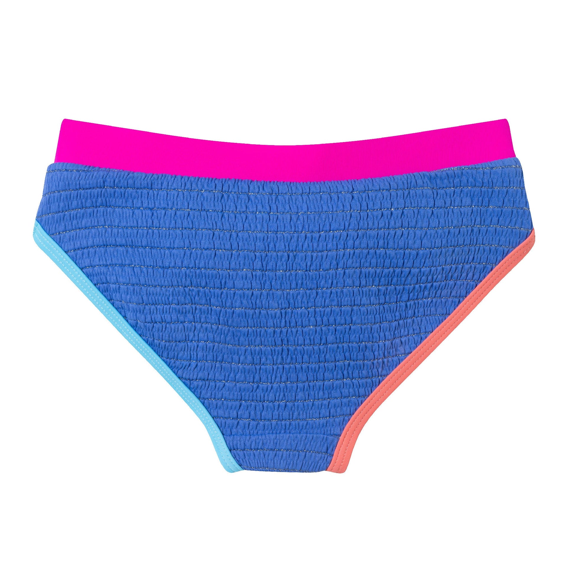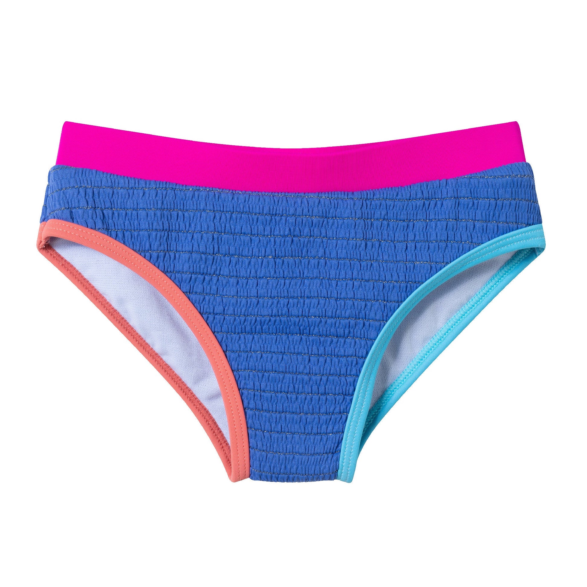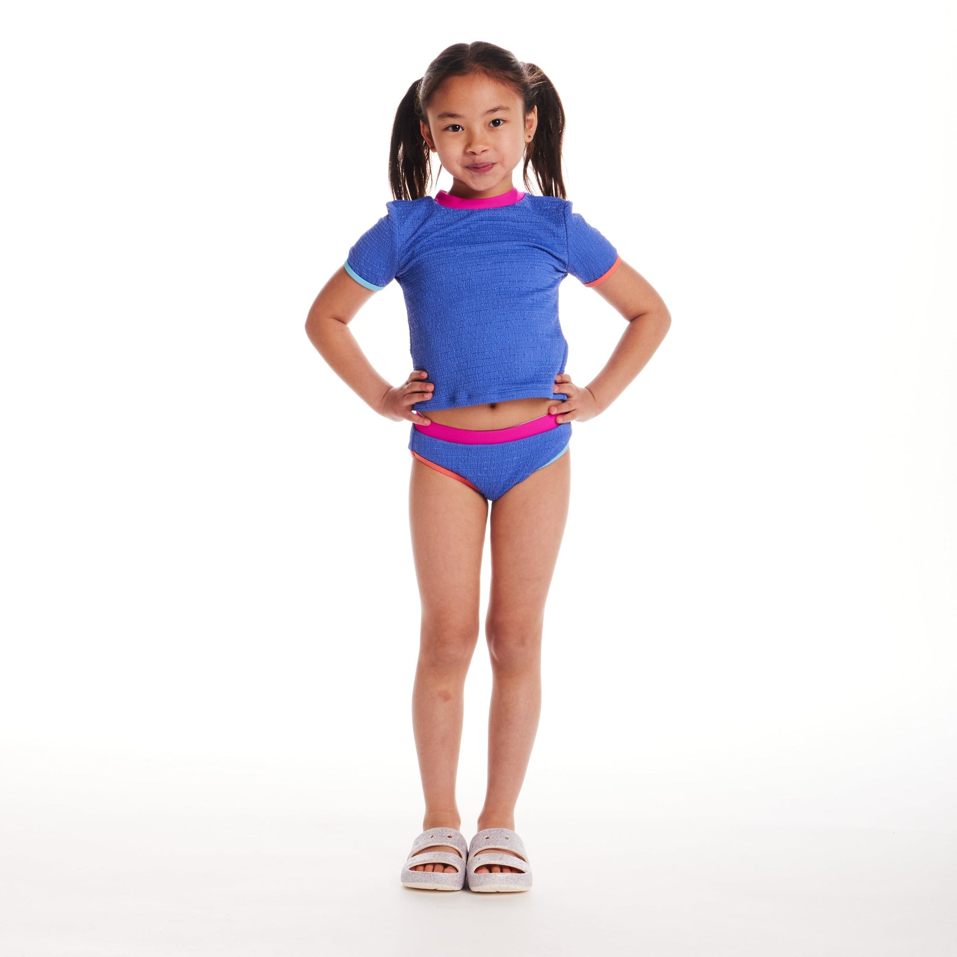 Make a splash in this bold and colorful two-piece swim set! Featuring a textured short sleeve rashguard top and matching bottoms with vibrant contrast trims, this set is designed for active water fun and all-day comfort. Stylish, sporty, and ready for adventure!