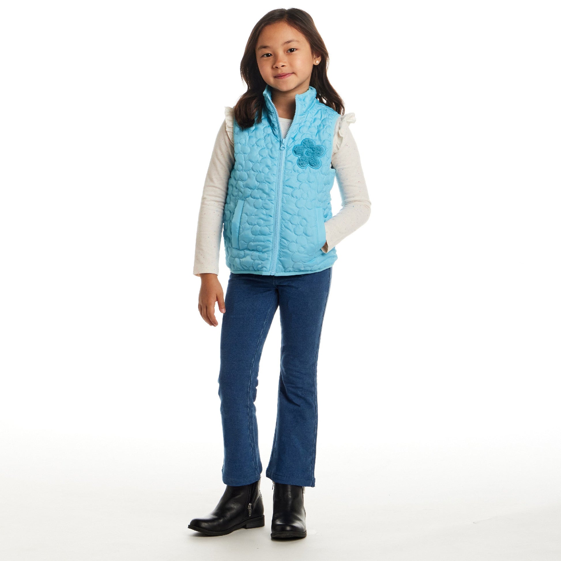A Pop of Flower Power Perfect for chilly mornings and breezy adventures, this sky-blue vest brings a burst of floral fun to every outfit. With quilted flower stitching and a bold 3D flower patch, it’s lightweight, cozy, and blooming with personality.