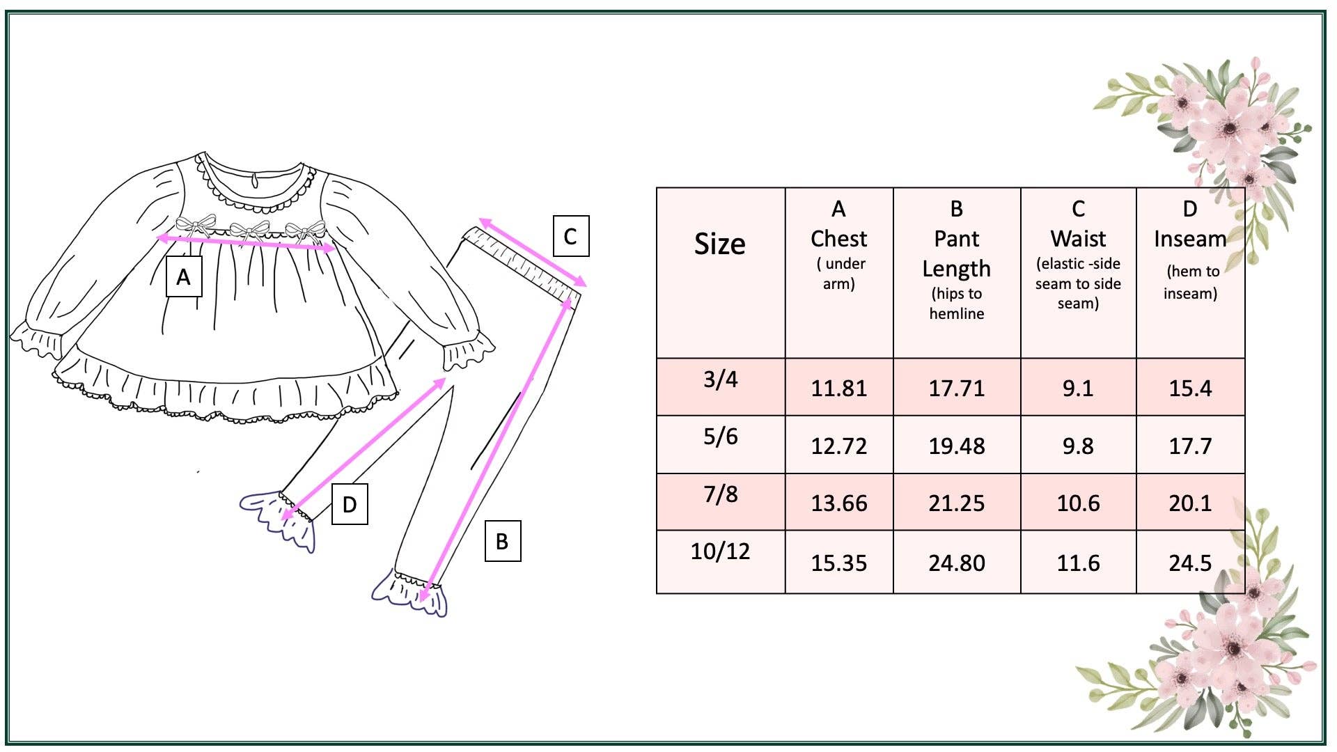 Girls two piece set includes red plaid long sleeve top with ruffles, white bows and trim accents and long pants with ruffle trim hem. Soft and comfy for lounging and playing on cozy fall winter christmas holidays.