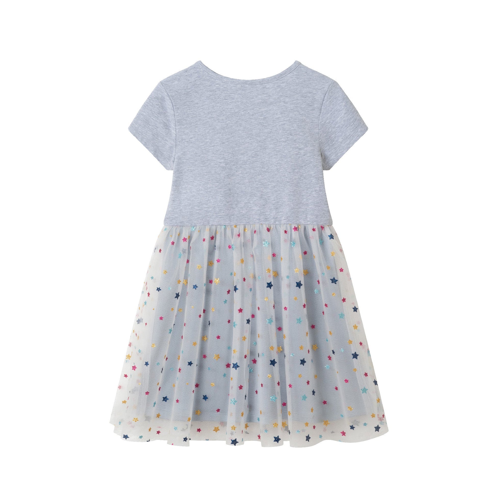 - Star Skirt Dress: Grey knit top with colorful star-print tulle skirt