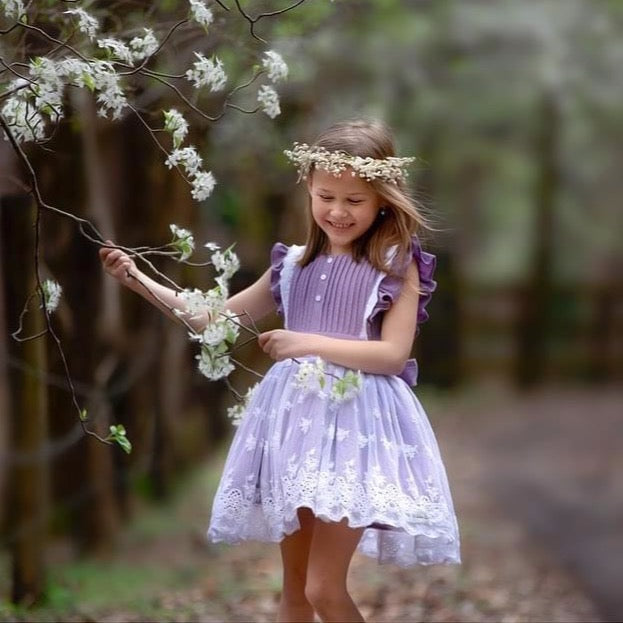 Beautiful vintage inspired crochet lace overlay skirt and detail on the flutter pinafore ruffles.