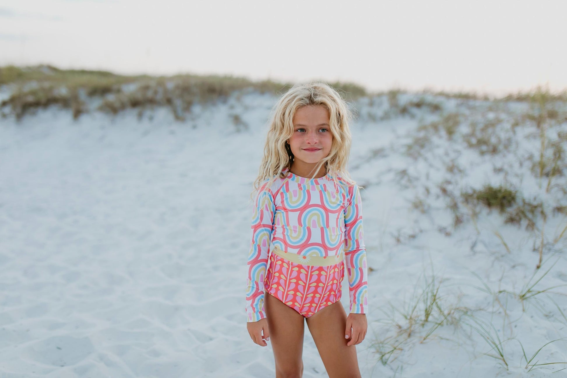 Girls coral & mustard rainbow daisy colored block stripe long sleeve one-piece zip up rash guard.