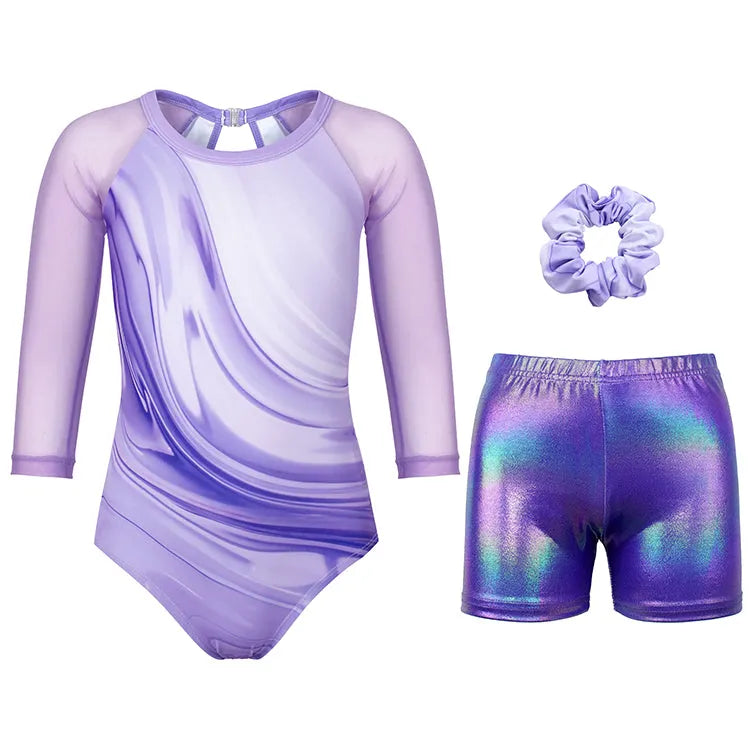 Lavender Marble Swirl 3/4 Mesh Sleeve Gymnastics Leotard Set for Girls