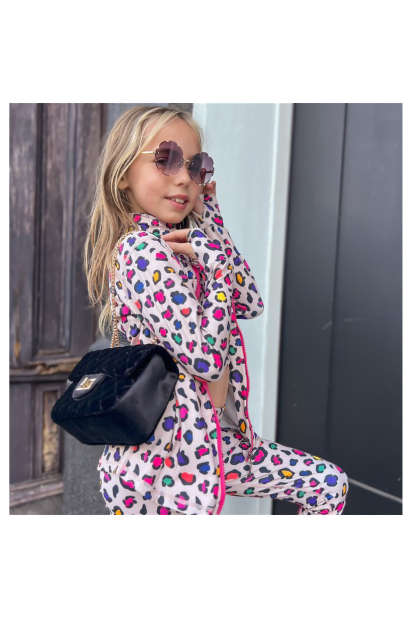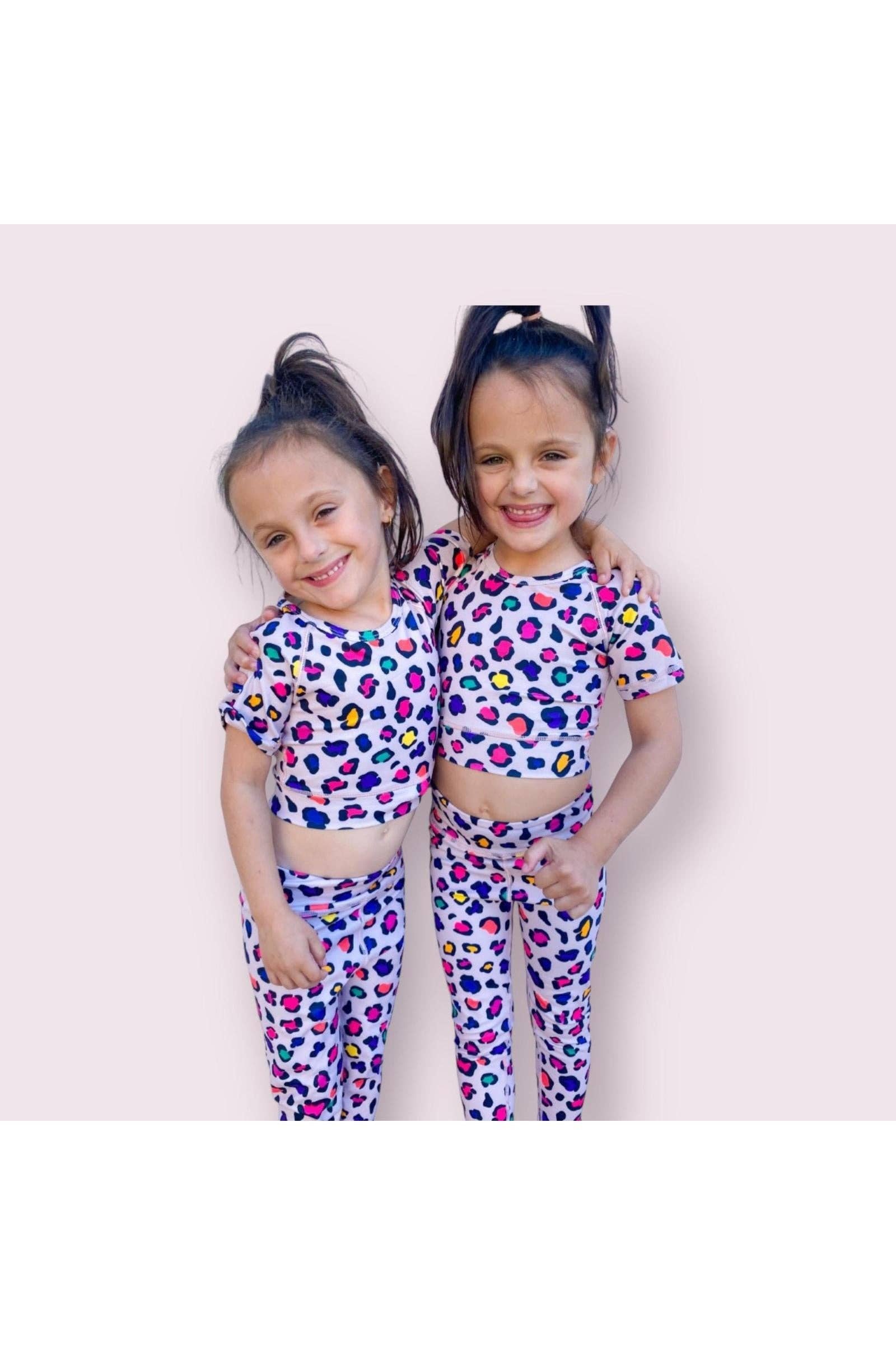 Introducing our stylish leopard pattern athletic set for girls, designed to combine comfort, functionality, and a trendy flair! This dynamic two-piece nylon spandex blended set features a short sleeve cropped top and coordinating leggings, perfect for young athletes or active play!