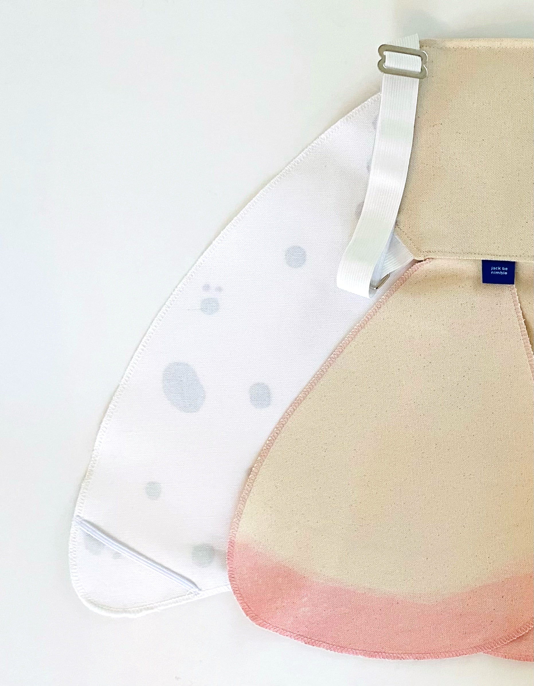 These spotted moth costume wings will spark hours of pretend play fun and nature inspired imaginative play! A faux fur detail adorns the white wings and the two lower wings are hand dyed to give this moth outfit the most magical pink touch.
