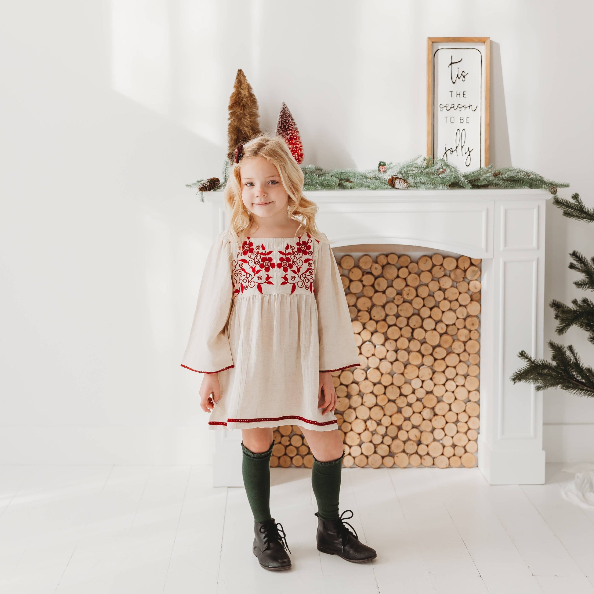Crafted from a soft linen blend, this dress features delicate hand embroidery that adds a touch of sophistication to its understated natural hue. Perfect for special occasions or everyday elegance, this dress moves gracefully with every step, making your little one feel like a princess. Pair it with sandals or sneakers for a look that's effortlessly chic and full of charm!