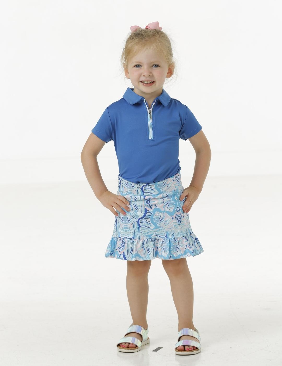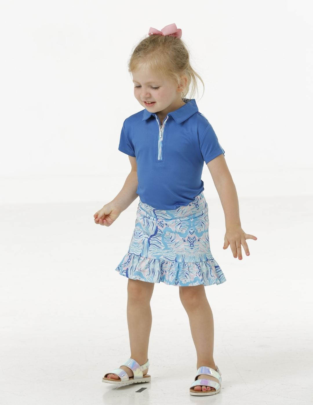 Let the little golfer in your life express her style on the green with this London Toddler Girls' Polo! This performance golf polo has a solid periwinkle base with subtle patterned accents to make a statement whether she's puttin' or chippin'. Pairs perfectly with the Saylor Skort for a winning look!