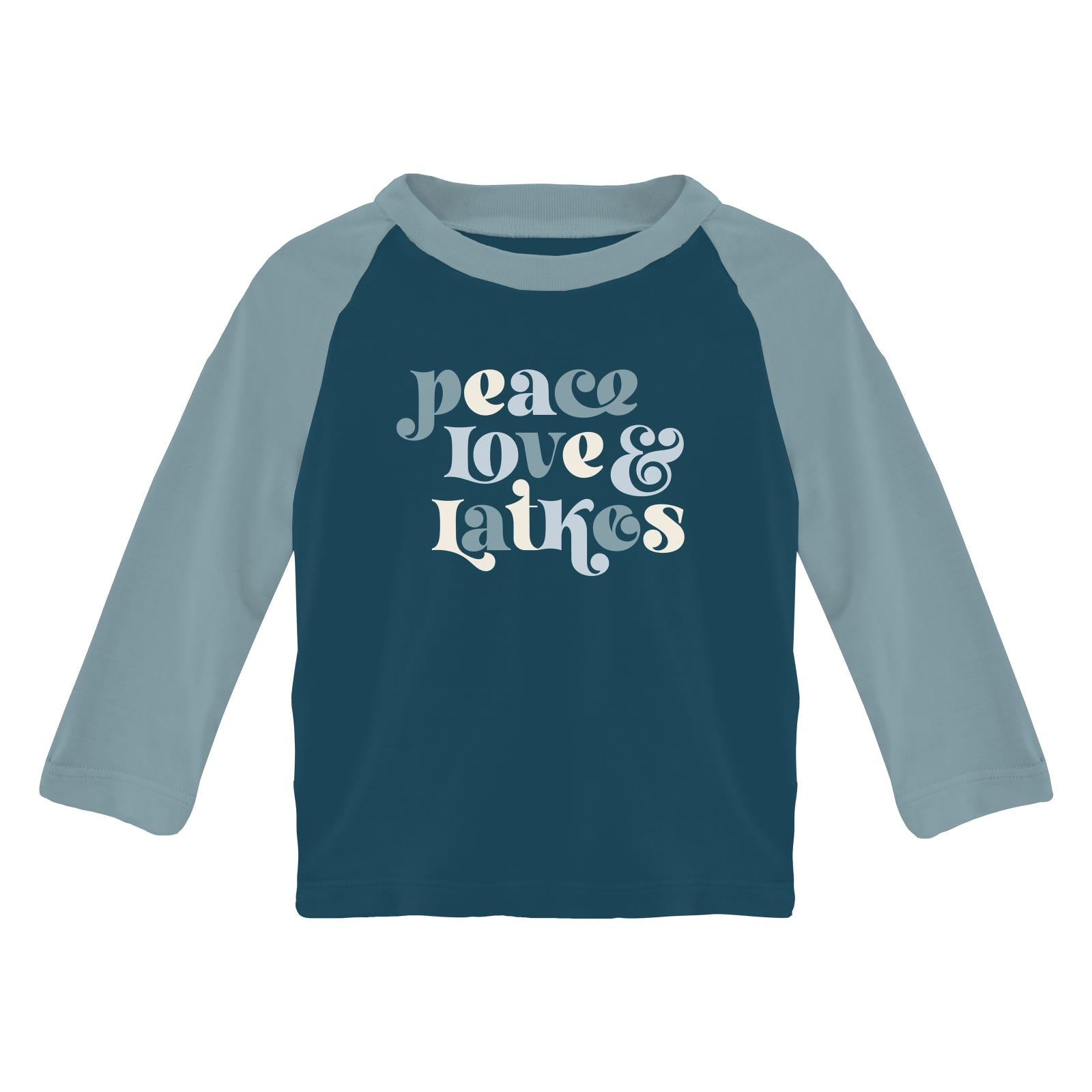 Long Sleeve Crew Neck Graphic Raglan Tee in Peacock Peace Love Latkes