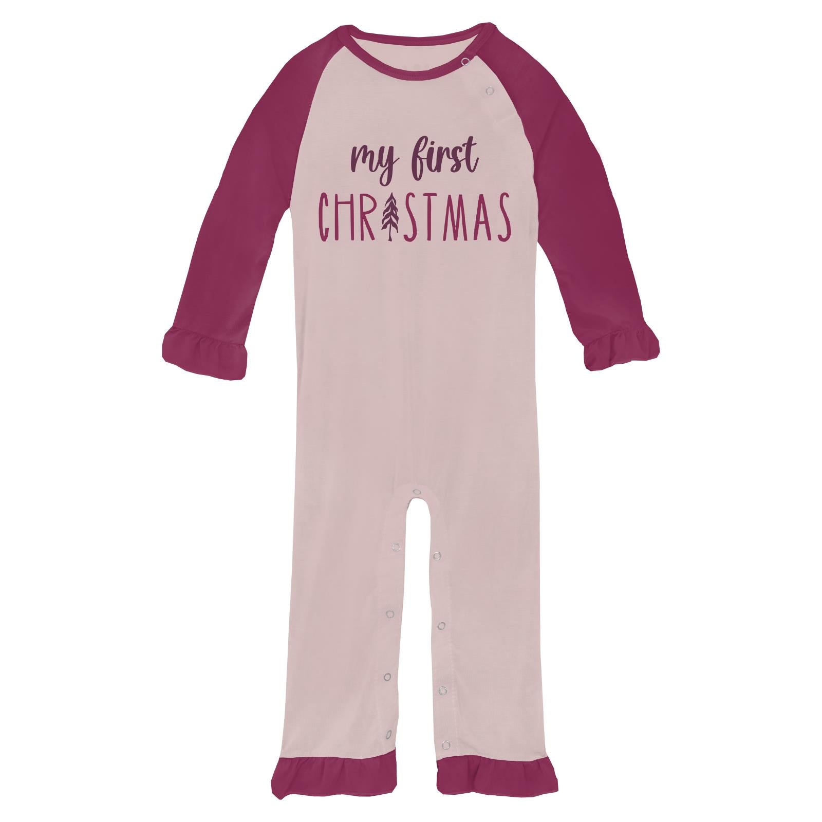 Long Sleeve Graphic Ruffle Raglan Romper in Baby Rose My First Christmas
