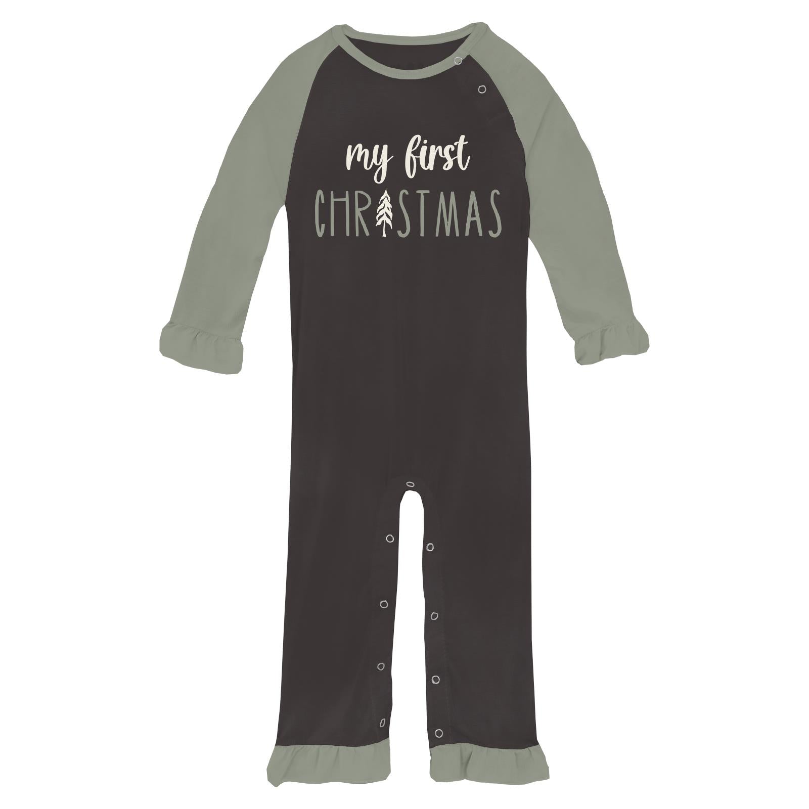 Long Sleeve Graphic Ruffle Raglan Romper in Midnight My First Christmas