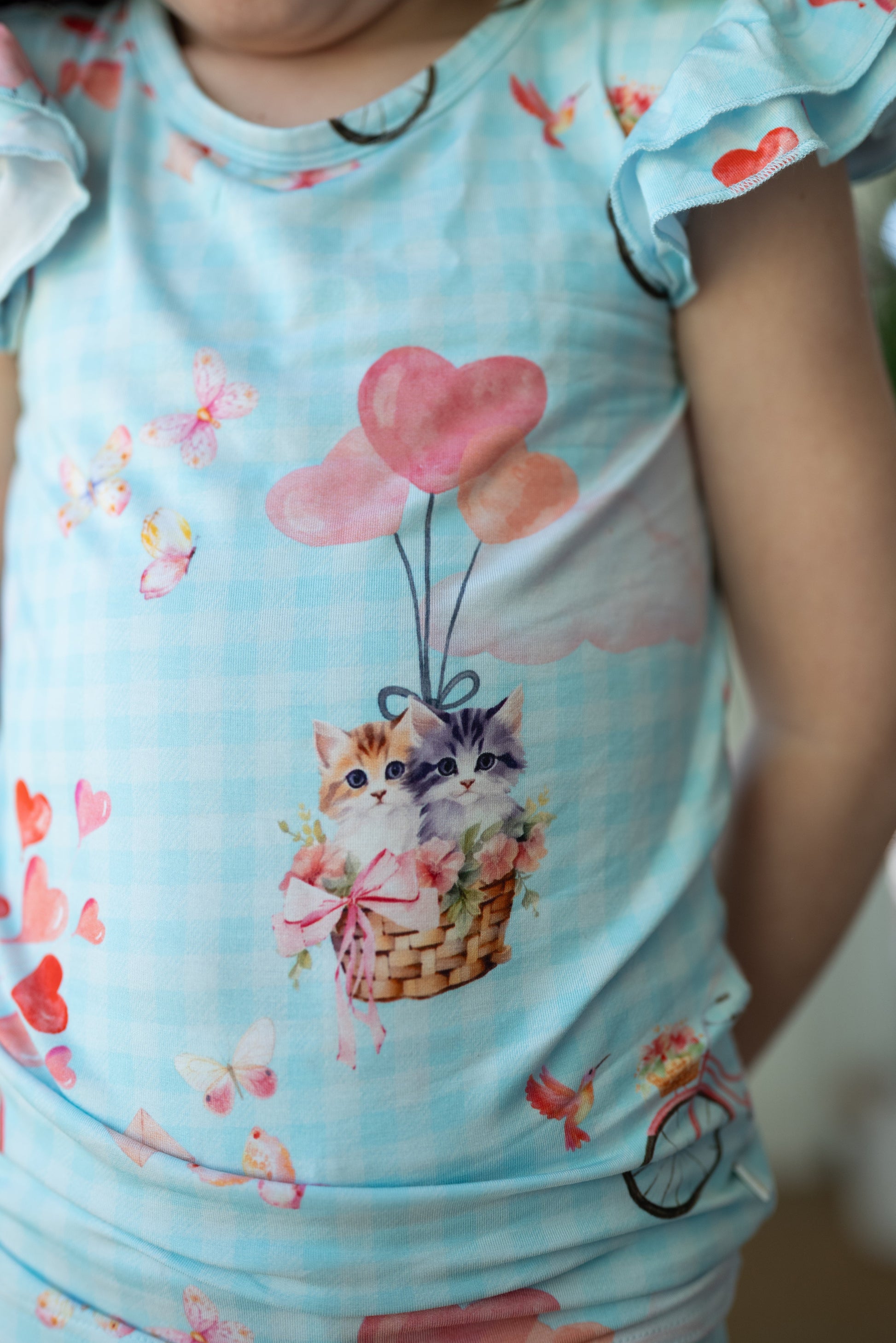This charming collection is purr-fect for Valentine's Day, blending comfort with whimsy. The soft, breathable fabric features a playful print of heart-shaped balloons, adorable kittens, and vintage bicycles, creating a sweet and fun vibe.